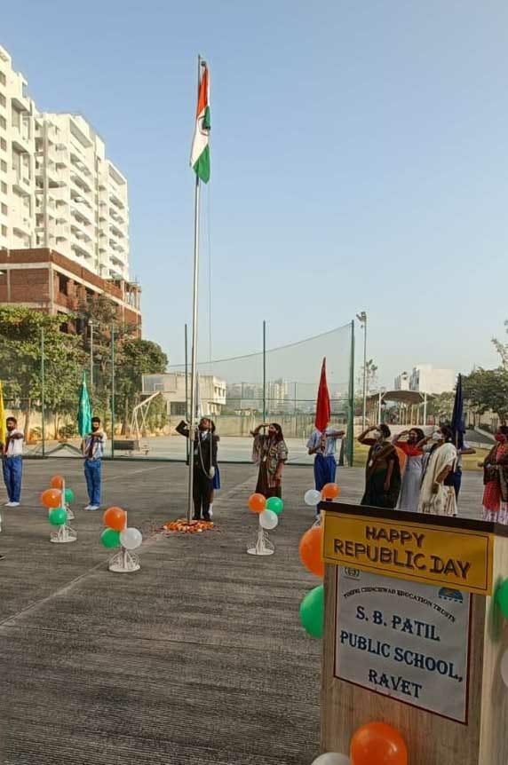 पिंपरी (दि. २६ जानेवारी २०२२) २६ जानेवारी प्रजासत्ताक दिनानिमित्त रावेत येथील पिंपरी चिंचवड एज्युकेशन ट्रस्टच्या (पीसीईटी) एस. बी. पाटील पब्लिक स्कूलमध्ये मुख्याध्यापिका डॉ. बिंदू सैनी यांच्या हस्ते ध्वजारोहन करण्यात आले. यावेळी