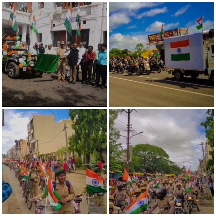 हरघर तिरंगा’ गतिविधि को लागू करके प्रत्येक नागरिक को घर पर तिरंगा झंडा लगाने के लिए प्रोत्साहित किया जा रहा है। इसी गतिविधि के तहत आज 12 अगस्त को वाशिम से मोटरसाइकिल रैली का आयोजन किया गया। कलेक्टर कार्यालय क्षेत्र से निकाली गई रैली को कलेक्टर षणमुगराजन व पुलिस अधीक्षक बच्चन सिंह ने झंडी दिखाकर रवाना किया। इस अवसर पर रेजिडेंट डिप्टी कलेक्टर शैलेश हिंगे, शिक्षा अधिकारी रमेश टांडगे, डिप्टी कलेक्टर सुहासिनी गोनेवार, जिला आपूर्ति अधिकारी तेजश्री कोरे, जिला सूचना एवं विज्ञान अधिकारी सागर हवालदार, सहायक जिला आपूर्ति अधिकारी राजेश वजीरे और लेखा अधिकारी युसूफ शेख सहित विभाग के अन्य अधिकारी मुख्य रूप से उपस्थित थे । इस अवसर पर पुलिस बैंड की टीम व उपस्थित लोगों ने राष्ट्रगान गाया।शुरू में कलेक्टर श्री. शनमुगराजन ने 1965 के भारत-पाक युद्ध में शहीद हुए सिपाही यशवंत सरकटे की पत्नी शांताबाई सरकटे, 1993 में जम्मू-कश्मीर में शहीद हुए योगराज नागुलकर की पत्नी मीराबाई नागुलकर और दिवंगत लांस नायक दगडू लहाने की पत्नी पार्वती लहाने को सम्मानित किया है। 1994 में जम्मू कश्मीर में एक वीरतापूर्ण मृत्यु। उन्हें फूल देकर सम्मानित किया गया। इस रैली से इन शहीदों की पत्नियों का माल्यार्पण कर उनका अभिनंदन किया गया।शहर के मुख्य मार्ग से जुलूस निकाला गया । मोटरसाइकिल रैली में भूतपूर्व सैनिक, पुलिस, होमगार्ड के साथ-साथ श्री बाकलीवाल विद्यालय के राष्ट्रीय छात्र सेना के छात्र, रानी लक्ष्मीबाई गर्ल्स स्कूल और जूनियर कॉलेज के छात्रों के साथ-साथ विभिन्न विभागों के अधिकारियों/कर्मचारियों ने भी भाग लिया । रैली के दौरान ‘घरघर तिरंगा’, वंदे मातरम, भारत माता की जय और मेरे वतन के लोगो संदेश से आते है सहित विभिन्न देशभक्ति के नारों से देशभक्ति का माहौल था। इन नारों और देशभक्ति के गीतों से भरा वाशिम का इलाका देश के लिए शहीद हुए जवानों की पत्नियों का चौक पर मौजूद नागरिकों ने फूल बरसाकर और गुलदस्ते देकर स्वागत किया। यह मोटरसाइकिल रैली कलेक्टर कार्यालय से सिविल लाइन होते हुए श्रीमती मालतीबाई सरनाईक से शुरू हुई। विद्यालय, बस स्टैंड चौक, डॉ. बाबासाहेब अम्बेडकर चौक दिघेवाड़ी, बालू चौक, छत्रपती शिवाजी महाराज चौक, पाटनी चौक, श्री शिवाजी विद्यालय, डॉ. बाबासाहेब अम्बेडकर चौक श्रीमती मालतीबाई सरनाईक स्कूल, बस स्टैंड चौक, नवीन परिषद कार्यालय, जिला सामान्य अस्पताल, अहले अस्पताल राजस्थान आर्य कॉलेज से कलेक्टर कार्यालय के पास पहुंचे। रैली में भाग लेने वाले छात्रों ने पुलिस अधीक्षक कार्यालय में स्थापित शस्त्र प्रदर्शनी का अवलोकन किया । इस प्रदर्शनी में प्रदर्शित विभिन्न हथियारों की जानकारी उपस्थित कर्मचारियों से प्