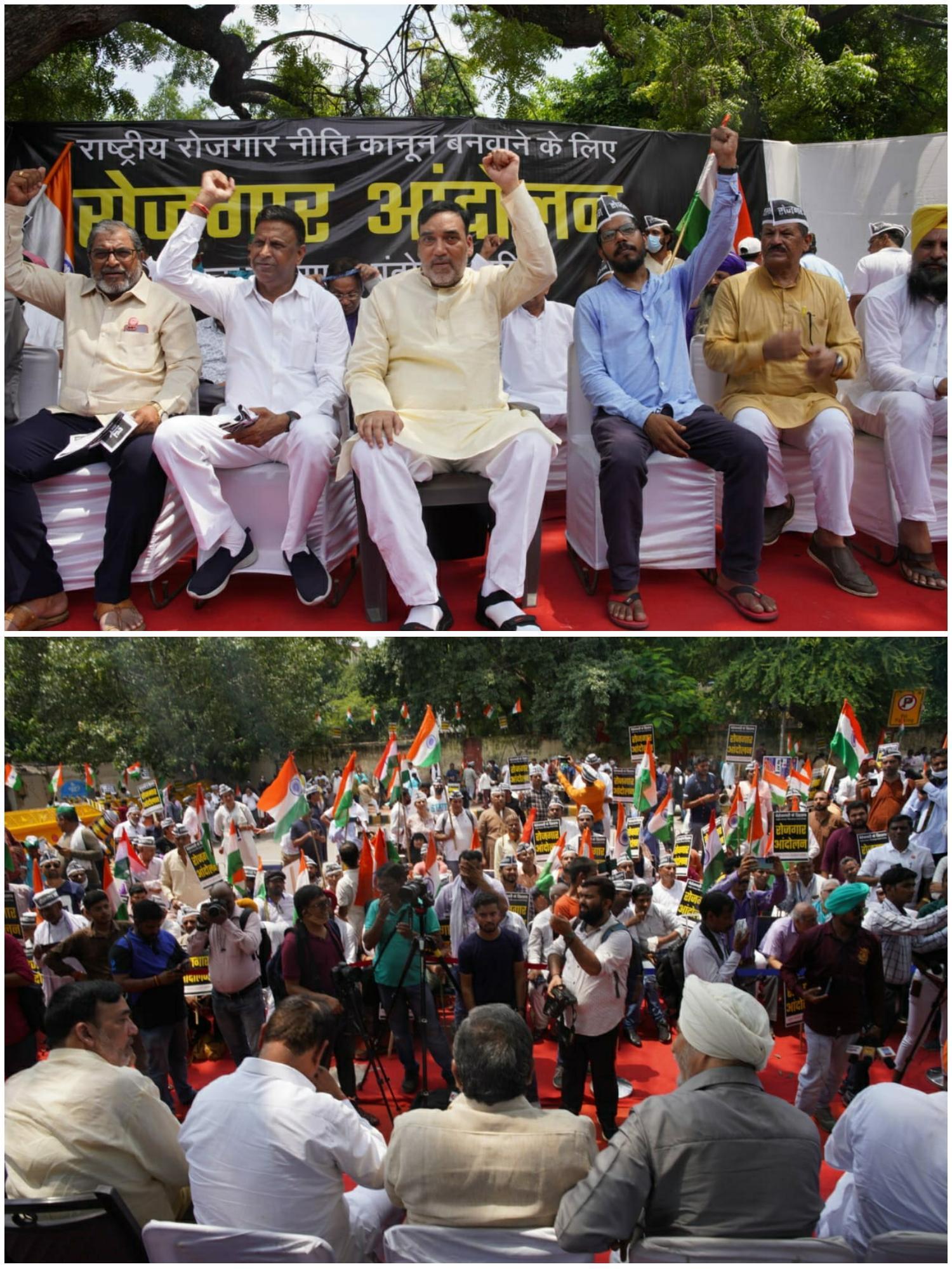 दिल्ली के कैबिनेट मंत्री एवं देश की बात फाउंडेशन के संस्थापक गोपाल राय ने बताया कि केंद्र सरकार ने 16 अगस्त से ही रोजगार आंदोलन को किसी न किसी तरह दबाने की कोशिश कर रही है | पहले नंदनगरी से जंतर मंतर तक निकलने वाली तिरंगा यात्रा को रोका गया , फिर नंदनगरी में ही शांतिपूर्ण तरह से चल रहे क्रमिक अनशन को बंद कर 200 से ज़्यादा आंदोलनकारियों को पुलिस द्वारा जबरदस्ती गिरफ्तार कर नंदनगरी आंदोलन स्थल को सील कर दिया गया | इसके साथ साथ कई बार प्रधानमंत्री और अलग अलग केंद्रीय मंत्रियो को राष्ट्रीय रोजगार नीति का ड्राफ्ट सौपने जा रहे संयुक्त रोजगार आंदोलन समिति से जुड़े विभिन्न संगठनो के कार्यकर्ताओ को जबरन पुलिस द्वारा गिरफ्तार किया गया | पिछले छह दिनों से केवल गिरफ्तारियां हो रही है ,और हमारे कार्यकर्ता हाथ में झंडा उठाए और सर पे रोजगार आंदोलन की टोपिया पहने गिरफ्तारियां दे रहा है | मैं अपने सभी नौजवान कार्यकर्ताओ को सलाम करता हूँ की इतनी मुश्किलों के बाद भी वह अपनी राह से अलग नहीं हुए | देशभर के अलग अलग राज्यों से आए हमारे सभी प्रतिनिधियों के हौसलों को मैं सलाम करता हूँ की पुलिस के कितना रोकने पर भी वह देश की तरक्की के लिए और देश के युवाओं के बेहतर भविष्य के लिए किसी भी तरह का समझौता करने को तैयार नहीं है |आज सुबह 10 बजे से केंद्र सरकार के खिलाफ संयुक्त रोजगार आंदोलन समिति द्वारा प्रदर्शन किया जा रहा है | इस अवसर पर हमारे सभी कार्यकर्ताओ का मनोबल बढ़ाने के लिए आम आदमी पार्टी के नेता संजय सिंह , बीएसपी से लोकसभा सांसद कुंवर दानिश अली , राष्ट्रीय किसान मज़दूर संगठन के संयोजक वीएम सिंह, स्वाभिमानी पक्ष के अध्यक्ष और पूर्व लोकसभा सांसद राजू शेट्टी, भारतीय किसान यूनियन के प्रमुख गुरनाम सिंह चढ़ूनी, भारतीय किसान यूनियन (अंबावत) के राष्ट्रीय अध्यक्ष ऋषिपाल अम्बावत आज यहाँ शामिल हुए है | इन सभी दिग्गज नेताओ की मौजूदगी से राष्ट्रीय रोजगार नीति को लेकर हमारी मांग को एक नई दिशा और ऊर्जा मिली है | इसके साथ ही आज जंतर मंतर पर रोजगार संसद का भी आयोजन किया जा रहा है , जहाँ मौजूदा सभी नेता और सामाजिक कार्यकर्ता राष्ट्रीय रोजगार नीति से जुड़े अपने अपने विचार को सभी के समक्ष रख रहे है |