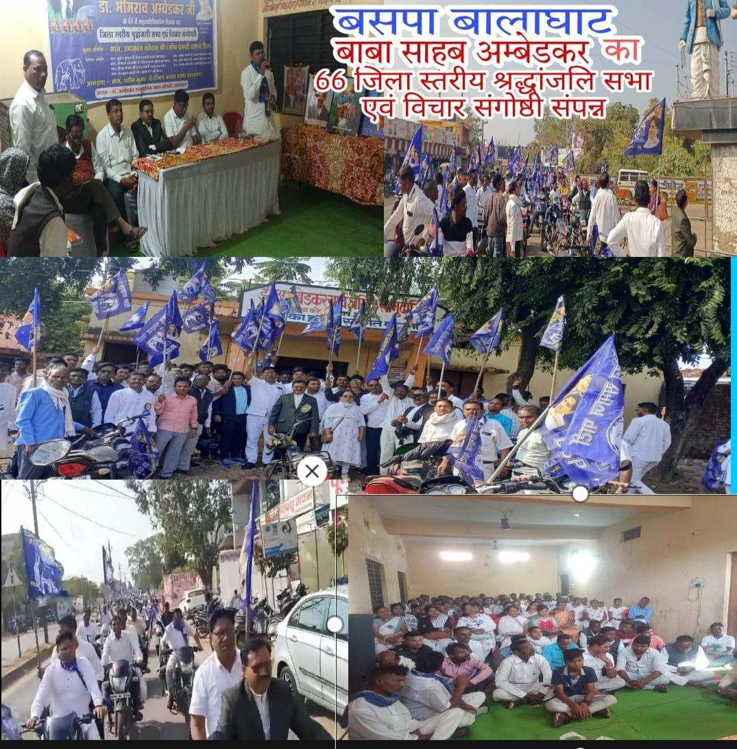 बहुजन समाज पार्टी बालाघाट इकाई के द्वारा संविधान रचेता डॉ बाबासाहेब आंबेडकर का 66 वा महापरिनिर्वाण दिवस बालाघाट जिला स्तर पर माननीय उमाकांतक्लिक बंदेवार जी जॉन प्रभारी रीवा के मुख्य आतिथ्य में संपन्न हुआ जिसमें बहुजन समाज पार्टी की सभी विधानसभाओं द्वारा बाइक रैली निकालकर बाबासाहेब अंबेडकर अमर रहे के नारों के साथ उनके महापरिनिर्वाण पर संकल्प दिवस आयोजित किया गया और बहुजन समाज पार्टी की सत्ता हासिल करके बाबा साहब के सपनों का भारत जाति विहीन समतामूलक भारत लोकतांत्रिक गणराज्य भारत बनाया जाएगा और साथ ही बहुजन समाज पार्टी बहुजन समाज के तमाम वर्गों को उनके संख्या के अनुपात में भागीदारी सुनिश्चित करने के लिए कि ऐसा संकल्प बहुजन समाज पार्टी की विचार गोष्ठी में मुख्य अतिथि के द्वारा रखा गया साथ ही जिला अध्यक्ष सचिन कुमार द्वारा कार्यक्रम में सभी विधानसभाओं और कार्यकर्ताओं सेक्टर अध्यक्ष से निवेदन किया आगामी समय में बहुजन समाज पार्टी का विशेष सदस्यता अभियान चल रहा है जिसके द्वारा समाज के सभी वर्गों में प्रदेश में राज्य में जिले में यह संस्था अभियान को संपन्न करे तो उस विशेष सदस्यता अभियान को पूरी तल्लीनता और एकजुटता के साथ मजबूत करें साथी सभी वर्गों और स्तर पर कार्यक्रम चलाकर विशेष सदस्यता अभियान को ताकत से पूर्ण करते हुए पार्टी की हर स्तर पर मजबूती और जनाधार बढ़ाया जाए कार्यक्रम में पार्टी के जिला पदाधिकारी जिला प्रभारी मुकेश कुमार दीपक मेश्राम खेमराज हरिनखेरे जिला उपाध्यक्ष उदय सिंह पंचेश्वर जी जिला महासचिव एडवोकेट राजपाल ऊके जी जिला कोषाध्यक्ष विजय सोनवानी जी विधानसभा बालाघाट अध्यक्ष पुनाराम नगर सुरेंद्र डोंगरे विधानसभा अध्यक्ष परसवाड़ा देवाजी रामटेके अध्यक्ष लांजी भुवनेश्वर मेश्राम अध्यक्ष वारासिवनी द्वारा अपनी समस्त विधानसभाओं के साथ साथी नगर अध्यक्ष एडवोकेट पदमा सूर्यवंशी बालाघाट द्वारा नगर की सभी महिला वर्गों को उसमें ताकत के साथ शामिल किया गया एवं पार्टी को सफल बनाने का प्रण लिया गया