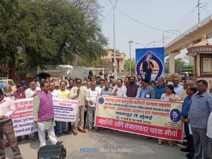 नागपूर -काष्ट्राइब महासंघ ,आल इंडिया आदिवासी एम्प्लॉईज फेडेरेशन, महाराष्ट्र राज्य राजपात्रित संगठना,व इतर संघटनाचे द्वारा महाराष्ट्र सरकारच्या दडपशाहीच्या विरोधात आणि जुनी पेन्शन, पदोन्नतीतील आरक्षण, कंत्राटी कर्मचार्यांचे न्याय हक्का साठी रॅली आज संविधान चौकातून मा अरुण गाडे अध्यक्ष काष्ट्राइब महासंघ यांचे नेतृत्वात व प्रा. मधुकर उईके, एस टी गायकवाड, विनोद निंबूलकर राजपत्रितअधिकारी संघटना यांचे पुढाकारात रवाना करण्यात आली,