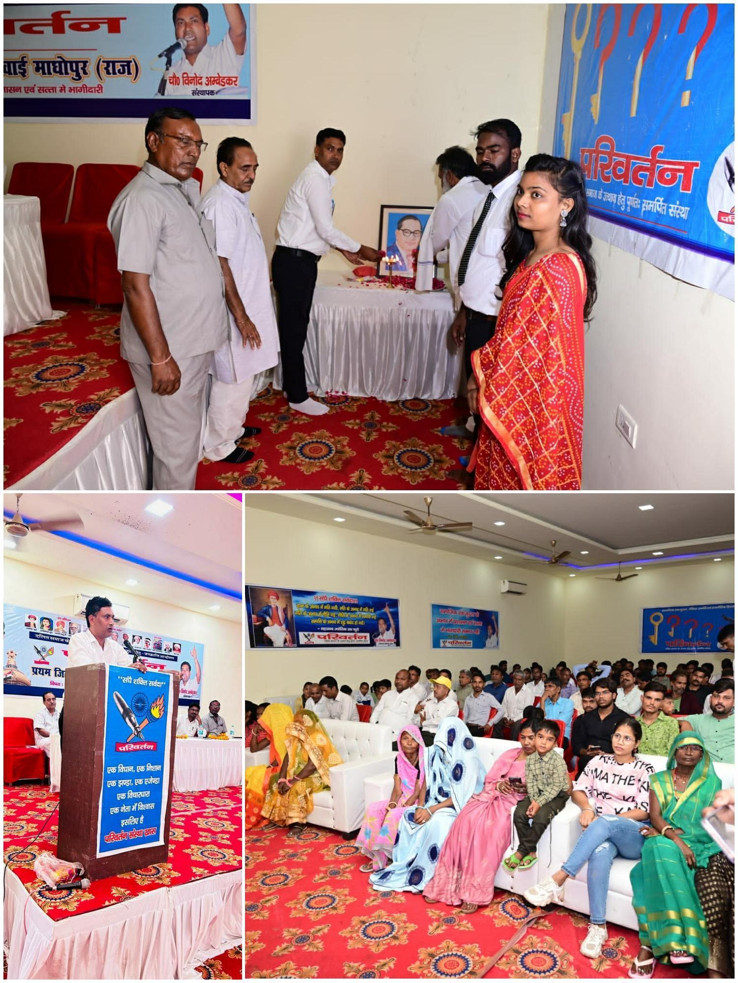 20 अगस्त को आयोजित सवाई माधोपुर के रणथंभौर विलास रिसोर्ट में सामाजिक एकजुटता से शिक्षा प्रशासन एवं सत्ता में भागीदारी को लेकर परिवर्तन संस्था के केंद्रीय अध्यक्ष वेद वीर सिंह आदिवासी की अध्यक्षता में द्वितीय जिला अधिवेशन का आयोजन किया गया। जिसका संचालन जिलाध्यक्ष शिव कुमार ने किया । इस अवसर पर बतौर मुख्य अतिथि संस्था प्रमुख चौधरी विनोद अंबेडकर की गरिमामयी उपस्थिति रही। अधिवेशन का शुभारंभ बाबा साहेब डॉ अंबेडकर के सम्मुख पुष्प अर्पित कर संस्था के समूह गान के साथ हुआ । अधिवेशन को संबोधित करते हुए मुख्य अतिथि संस्था प्रमुख चौधरी विनोद अंबेडकर ने कहा कि-“जो समाज अपने महापुरुषों एवं अपने इतिहास को नहीं जानता वह समाज कभी सामाजिक रूप से एकजुट नहीं हो सकता और बिखरा हुआ समाज हमेशा दीन-हीन बना रहता है, आप लोग अपनी दशा तों देखो; ना शिक्षा में ना प्रशासन में ना सत्ता में, आपको किसी भी क्षेत्र में ना तो जनसंख्या के अनुपात में हिस्सेदारी मिल रही है और ना ही सामाजिक सम्मान। कहीं भी तो नहीं हो। इसलिए आप लोगों पर अत्याचार होते हैं, हक मारी हो रही है, आखिर कब तक गरीबी और जिल्लत का जीवन जिओगे ? मैं आप लोगों को ऐसी दशा से बहुत चिंतित और चिंतनशील हूॅं तथा अंतिम पायदान की जातियों को शिक्षा प्रशासन एवं सत्ता में भागीदारी दिलाना चाहता हूॅं, जो सामाजिक एकजुटता के बिना संभव नहीं है। अगर शिक्षा प्रशासन और सत्ता में भागीदारी नहीं होगी तो आपके साथ अत्याचार कभी खत्म नहीं होंगे और ना ही हक मारी रुकेगी; आप लोग मुझ पर भरोसा करके फुले, अंबेडकर, कांशीराम की विचारधारा से सामाजिक एकजुटता पैदा करने में सहयोग करें तो मैं आप लोगों को शिक्षा प्रशासन और सत्ता में भागीदारी बोनस में दूॅंगा लेकिन आपकी प्रॉब्लम यह है कि आपको दोस्त और दुश्मन की पहचान नहीं है आप उन्हीं राजनीतिक दलों सामाजिक संगठनों और तथाकथित नेताओं के पीछे दौड़ते रहते हो जो आपको हमेशा अपना पिच्छलगू बनाए रखते हैं, ध्यान रहे उनकी मंशा कभी भी तुम्हें कुछ देने की नहीं है।”