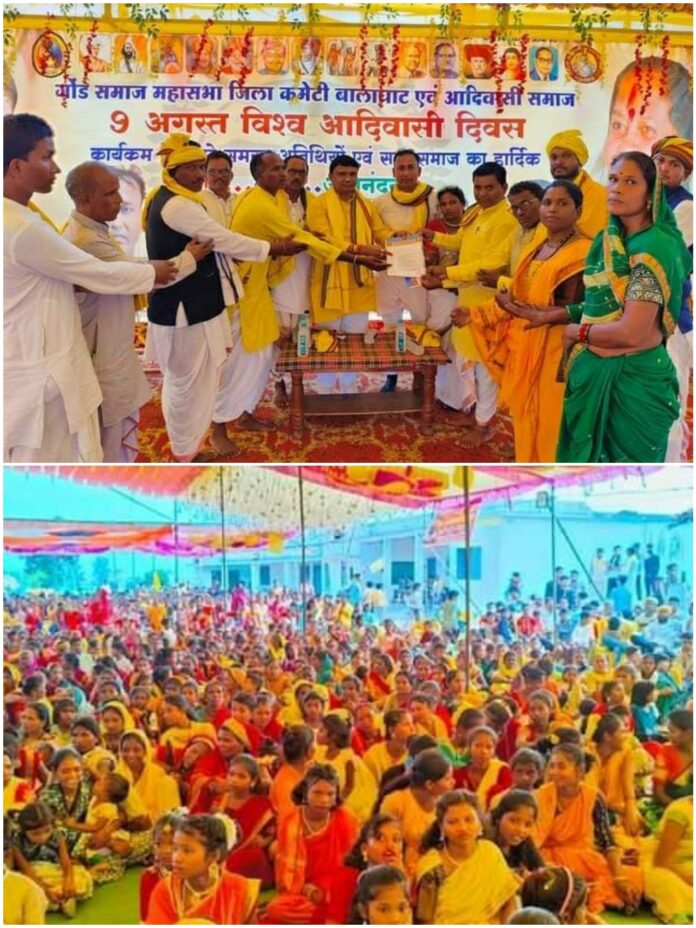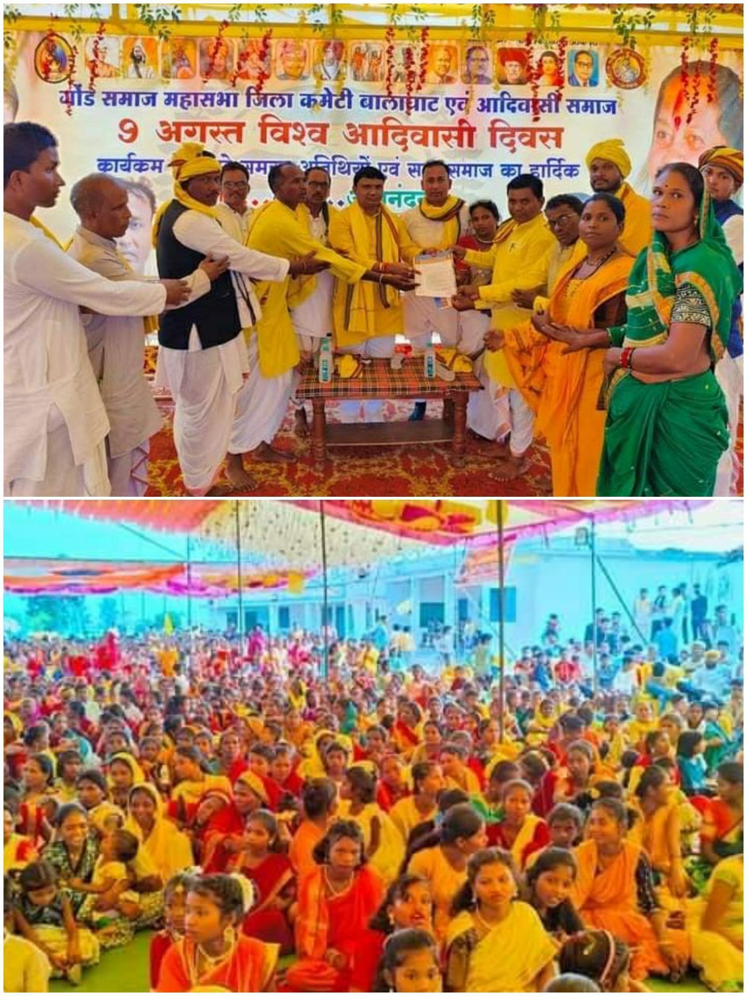 विश्व आदिवासी दिवस के अवसर पर आज 09 अगस्त को सरस्वती शिशु मंदिर ग्राउंड लामता में गोंड समाज महासभा द्वारा वृहद स्तर पर आदिवासी सम्मेलन का सामाजिक कार्यक्रम आयोजित किया गया। आदिवासी समाज द्वारा आयोजित इस कार्यक्रम में मध्यप्रदेश शासन के आयुष एवं जल संसाधन राज्य मंत्री श्री रामकिशोर नानो कावरे, गोंड समाज महासभा के श्री राधेलाल मर्सकोले, जनपद पंचायत बालाघाट के अध्यक्ष श्री फुलचंद सहारे, उपाध्यक्ष डॉ. शंकरलाल बिसेन, पूर्व जनपद अध्यक्ष श्री पूरनलाल ठाकरे, लामता एवं आसपास की ग्राम पंचायतों के सरपंच, अन्य गणमान्य नागरिक एवं बड़ी संख्या में आदिवासी समाज के लोग उपस्थित थे।