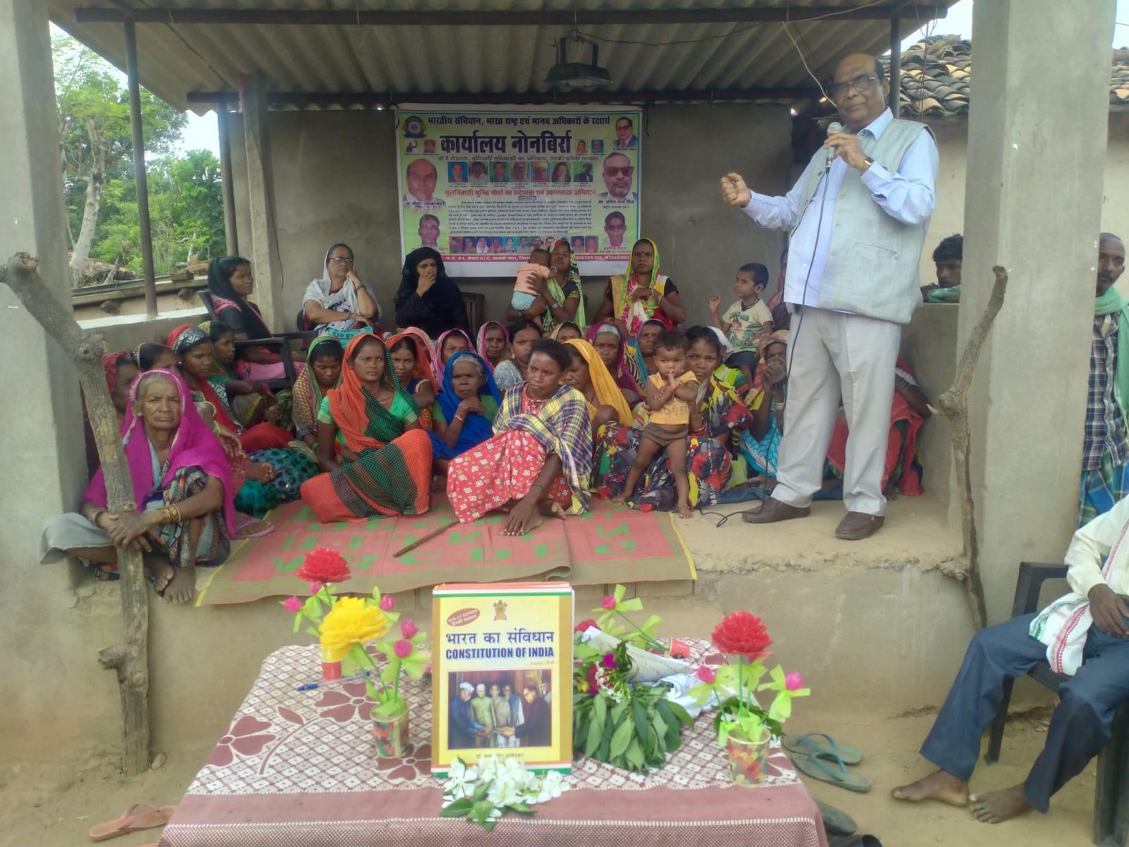 हम देंगे सभी जरूरत मंद बेरोजगारों को न्यूनतम 25000/ रू का मासिक रोजगार , हम देंगे आम जनता को बुनियादी सुविधाओं की गारंटी के अधिकार उसकी बनाओ सरकार तथा भारत राष्ट्र,भारतीय संविधान एवं मानव अधिकारों के रक्षार्थ अनवरत जनहितैसी एजेंडा पर आम जनता को संगठित किया जा रहा है। इस दिशा में राष्ट्रीय संयुक्त मोर्चा भारत के घटक संगठन मूलनिवासी मुक्ति मोर्चा भारत के तत्वावधान में छत्तीसगढ़ के रामपुर आदिवासी विधान सभा क्षेत्र में ग्राम तेलाई डबरा में भारत राष्ट्र नव निर्माण अभियान के अन्तर्गत दिनांक 29/08/2023 को संविधान सत्संग का आयोजन किया गया।इस कार्यक्रम के मुख्य अतिथि संयुक्त मोर्चा भारत के राष्ट्रीय संयोजक गोपाल ऋषिकर भारती,अध्यक्षता मोर्चा के महासचिव एवं ग्राम ढोंगधरहा के सरपंच मालिकराम कंवर ,विशेष अतिथि मूलनिवासी मुक्ति मोर्चा की प्रदेश सचिव श्रीमती स्मृति जॉन, जिला कोरबा संयोजक क्रांति कुमार साव,संभागीय अध्यक्ष सतपालदास महंत,संगठन मंत्री हलीम खान,जिला संगठन सचिव अंजुम परवीन ,जिला महिला उपाध्यक्ष दिलोबाईं मंझवार,ग्राम नोनबिर्रा सचिव सुन्नतून ,वार्ड सचिव सकीना बानो, ग्राम तेलाई डबरा सचिव रूपसिंह मंझवार मुक्त रूप से उपस्थित होकर सभा में अपने विचार रखे।इस सभा में मोर्चा के अध्यक्ष गोपाल भारती ने भारतीय संविधान की महिमा और देश की जनता को दिए गए मानव अधिकारों की जानकारी दिए।साथ ही रामपुर आदिवासी क्षेत्र के मिशन 2023 के लिए विधायक प्रत्यासी के रूप में ग्राम धों ढोंगधारहा के सरपंच, कर्मठ संघर्षशील समाज सेवक आदिवासी नेता मालीकराम कंवर को सर्वसम्मति से प्रस्तावित प्रत्याशी घोषित किया।सभा को संबोधित करते हुए गोपाल भारती ने मोर्चा के एजेंडा के मुख्य बिंदुओ के बारे में बताया कि 1, हम देंगे सभी जरूरतमंदों को न्यूनतम 25000/रु मासिक का रोजगार,और सभी जरूरतमंद गरीबों को निःशुल्क शिक्षा,चिकित्सा,300यूनिट बिजली,स्वच्छ पेयजल,पक्के मकान जैसी बुनियादी सुविधाओं की गारंटी के कानूनी अधिकार ।अबकी बार बनाओ राष्ट्रीय संयुक्त मोर्चा भारत की सरकार। आदिवासी गांव में पहली बार किसी संगठन ने भारत के संविधान का दर्शन कराया लोगों ने भारत का संविधान जिंदाबाद,भारत राष्ट्र जिंदाबाद,भारत का इंसान जिंदाबाद के जोरदार नारे लगाए। साथ ही संविधानिक अधिकार चेतना के लिए जुलूस निकाला गया।