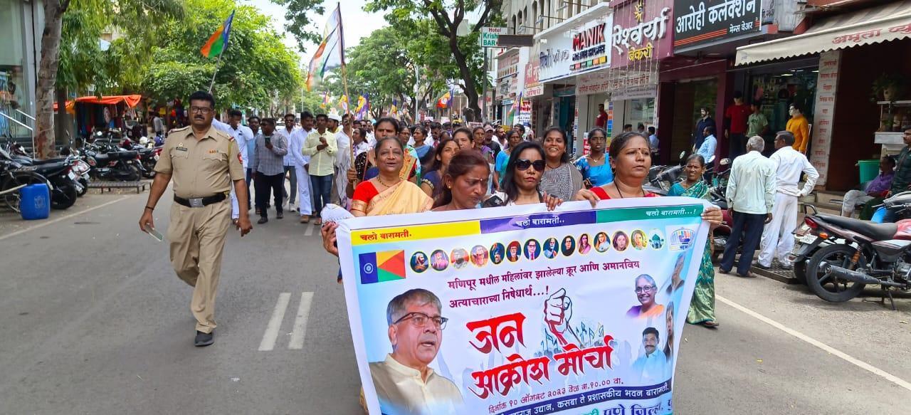 बारामती दि १० , मणिपूरमध्ये मध्ये घडलेल्या महिला अत्याचाराच्या निषेधार्थ वंचित बहुजन आघाडी पुणे जिल्हा पूर्व तर्फे बारामती प्रांत कार्यालयावरती निषेध मोर्चा काढण्यात आला त्यावेळी बोलताना जिल्हा अध्यक्ष राज कुमार म्हणाले अस्वस्थ मणिपूर आहे कि अस्वस्थ भारत आहे? मणिपूर धगधगतंय कि संपूर्ण भारत धगधगतोय? मणिपूर हादरलय कि संपूर्ण भारतीय समाजच हादरला आहे? विटंबना दोन स्त्रियांची झाली कि भारतातील संपूर्ण स्त्री जातीची झाली? विवस्त्र धिंड दोन स्त्रियांची निघाली, कि हजारो वर्षांचा इतिहास असणा-या भारतीय संस्कृतीची निघाली?