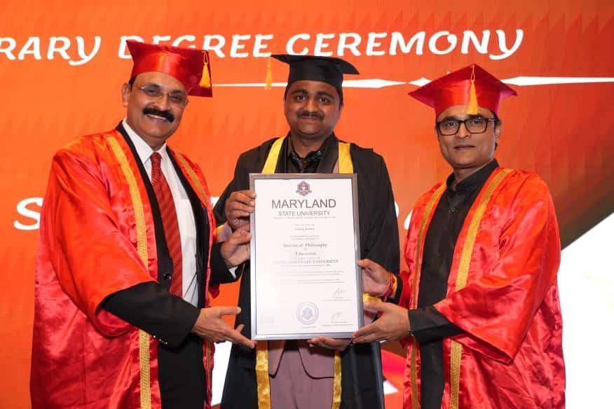बारामती:- लिला ॲबियन्स, दिल्ली येथे पार पडलेल्या पदवी प्रदान कार्यक्रमात मेरीलॅड स्टेट युनिव्हर्सिटी अमेरिका यांच्या कडुन तरुण वयातील विद्यार्थी जीवन, विद्यार्थ्यांचे अभ्यासातील एकाग्रता व दैनंदिन जीवनातील समस्या यावर सादर केलेल्या शोध प्रबंधास प्रा सुविराज कदम याना पीएचडी (डॉक्टरेट) प्रदान करण्यात आली, कार्यक्रमासाठी प्रमुख पाहुणे म्हणून राज्य सभा सदस्य अमर पटनाईक , कॅबिनेट जॉईंट सेक्रेटरी सौरभ कुमार तिवारी , डॉ रणजित कुमार सिंग आय,ए,एस , प्रथम महिला बॉर्डर सिक्युरिटी फोर्स कमांडट तनुश्री पारिक, सिने अभिनेत्री शिवानी शर्मा, स्व्वॉशबॉल खेळातील प्रथम भारतीय एशियन ज्युनिअर चॅम्पियन रवी दिक्षित अदी उपस्थित होते, सुविराज कदम सर हे बारामती मध्ये गेल्या पंधरा वर्षांपासून कदम क्लासेस ॲड इंटिग्रेटेड ॲकॅडमी नावाने शैक्षणिक संस्था चालवतात, शेकडो विद्यार्थ्यांच्या जीवनाशी त्याचा गेल्या पंधरा वर्षांपासून जवळचा संबंध राहिला आहे , विद्यार्थ्यांचीही वाढत्या वयामध्ये बदलणारी मानसिकता , अभ्यासाचा वाढता ताण तणाव व्यवस्थापन कौटुंबिक जीवनामध्ये विद्यार्थ्यांच्या मानसिकतेचा अभ्यास यावर गेली सलग तीन वर्षे प्रा सुविराज कदम सर सातत्याने अभ्यास करीत होते,त्याचा शोध प्रबंध गेल्या वर्षी विद्यापीठाकडे सादर करण्यात आला होता.