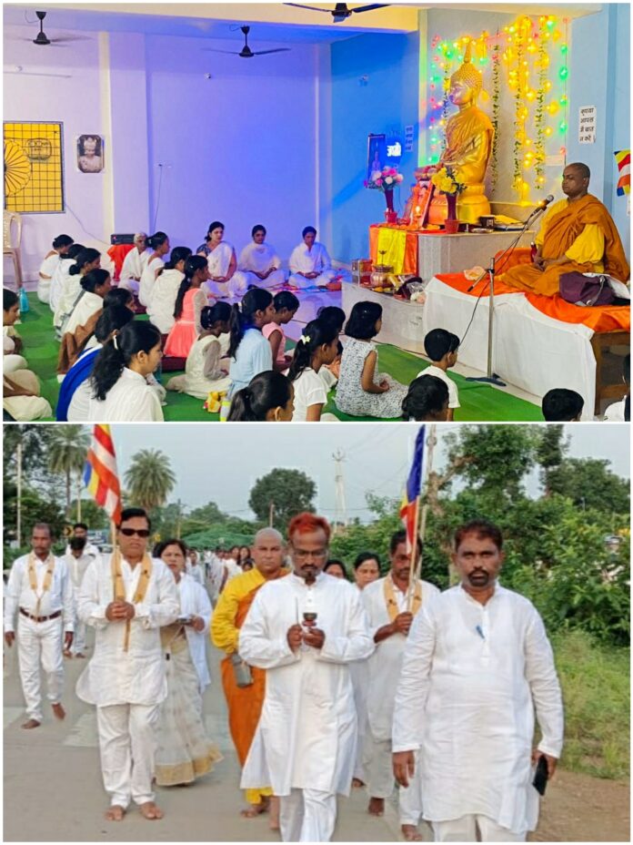 (बालाघाट जिला बौद्ध संघ बालाघाट एव प्रज्ञा दीप बुद्ध विहार समिती कटंगी के सयुक्त तत्वाधान में ध्यान साधना सद्धम्म प्रशिक्षण 8दिवसीय शिविर संपन्न ) कटंगी (बालाघाट)बालाघाट जिला बौद्ध संघ बालाघाट”तहसील शाखा कटंगी, नगर बौद्ध संघ कटंगी एवं प्रज्ञा दीप बुद्ध विहार समिति के संयुक्त तत्वाधान में प्रज्ञा दीप बुद्ध विहार कटंगी में दिनांक 22 अगस्त २०२३ से 29 अगस्त २०२३ तक आठ दिवसीय ध्यान साधना सद्धम्म प्रशिक्षण शिविर आयोजित किया गया! ध्यान साधना सद्धम्म प्रशिक्षण शिविर कटंगी में पूज्य भदंत धम्म शिखर जी बालाघाट द्वारा बौद्ध उपासक उपासिकाओं को तथागत बुद्ध के बुद्ध धम्म को विस्तार पूर्वक बताए तथा तथागत बुद्ध के बुद्ध धम्म को देवनामप्रिय महान सम्राट अशोक व आधुनिक बुद्ध परम पूज्य डॉ बाबासाहेब अंबेडकर जी के द्धारा बुद्ध धम्म के उत्थान के संदर्भ में अवगत कराए पूज्य भदंत धम्म शिखर जी ने प्रशिक्षण के दौरान उपासक उपासिकाओं को बताया कि तथागत बुद्ध धम्म में बुद्ध शरणम गच्छामि बुद्ध का अर्थ बुद्धत्व – धम्म शरणम गच्छामि सम्मार्ग “संघम शरणम गच्छामि अर्थात तथागत बुद्ध का भिक्षु संघ के बारे में विस्तार से अवगत कराया और बताए की तथागत बुद्ध को संबोधि प्राप्त होने के उपरांत संसार के चार आर्य सत्य का साक्षात्कार किया दु:ख आर्य सत्य है ,मनुष्य को जीवन में कभी न कभी दु:ख से सामना करना पड़ेगा दुःख आने का कोई न कोई का कारण निश्चित होता है मानव जीवन मे जो दुःख आते है उन दु:खों का निवारण करने के उपाय बताए दुःख का उपसमन के संबध में तथागत बुद्ध के 8 अष्टांगिक मार्ग है। तथागत बुद्ध के बनाए 8अष्टांगिक मार्ग को सम्यक रूप से जीवन में अंगीकार करने से मनुष्य दु:खों से मुक्त होकर सुखी रह सकता है। सम्यक दृष्टि” सम्यक संकल्प” सम्यक वाचा “सम्यक क्रमांर्त” सम्यक आजीविका “सम्यक व्यायाम” सम्यक् स्मृति “सम्यक समाधि “पूज्य भदंत धम्म शिखर जी द्वारा तथागत बुद्ध के बौद्ध धम्म सिद्धांतों में 10 पारिमिताओं का विस्तार पूर्वक बताते हुए कहा की मनुष्य को प्राणियों के साथ अच्छे से आचरण अवश्य करना चाहिए पारिमिताओ शील ” दान “अपेक्षा “नैष्कर्म” वीर्य “शांति” अधिष्ठान “करुणा “मैत्री “सभी पारिमिताओ का पालन प्रत्येक व्यक्ति को करना चाहिए पारिमिताओ के इन गुणों को अपनी पूरी सामर्थ्य के साथ व्यवहार में अपनाने से ही मानव का उत्थान सम्भव है ।पूज्य भदंत धम्म शिखर जी ने उपासक उपासकों को अष्टशील के महत्व को विस्तार पूर्वक समझते हुए बताया प्राणी हिंसा से विरत रहना “झूठ बोलने से विरत रहना “चोरी करने से विरत रहना “काम मिथ्याचार से विरत रहना “सभी प्रकार के मादक द्रव्यो को सेवन करने से विरत रहना “विकाल भोजन से विरत रहना “विलासिता पूर