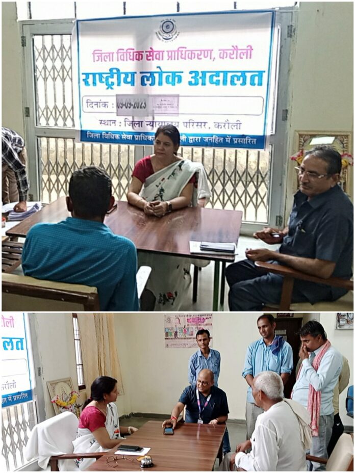 माननीय राजस्थान राज्य विधिक सेवा प्राधिकरण, जयपुर के निर्देशानुसार एवं जिला विधिक सेवा प्राधिकरण की अध्यक्ष एवं जिला एवं सेशन न्यायाधीश श्रीमति माधवी दिनकर के निर्देशन में आज दिनांक 09 सितम्बर 2023 को करौली जिले के समस्त न्यायिक न्यायालयों समस्त राजस्व न्यायालयों, जिला उपभोक्ता प्रतितोष आयोग करौली व श्रम विभाग करौली में लंबित सभी प्रकृति के (Pending and Pre-Litigation Matters) विवादों से संबंधित एक दिवसीय राष्ट्रीय लोक अदालत का आयोजन ऑफलाईन के साथ-साथ ऑनलाईन माध्यम से किया गया। जिला विधिक सेवा प्राधिकरण की सचिव एवं अपर जिला एवं सेशन न्यायाधीश श्रीमति बीना गुप्ता ने माँ सरस्वती के चित्रपट पर दीप प्रज्वलित कर राष्ट्रीय लोक अदालत का शुभारम्भ किया गया।