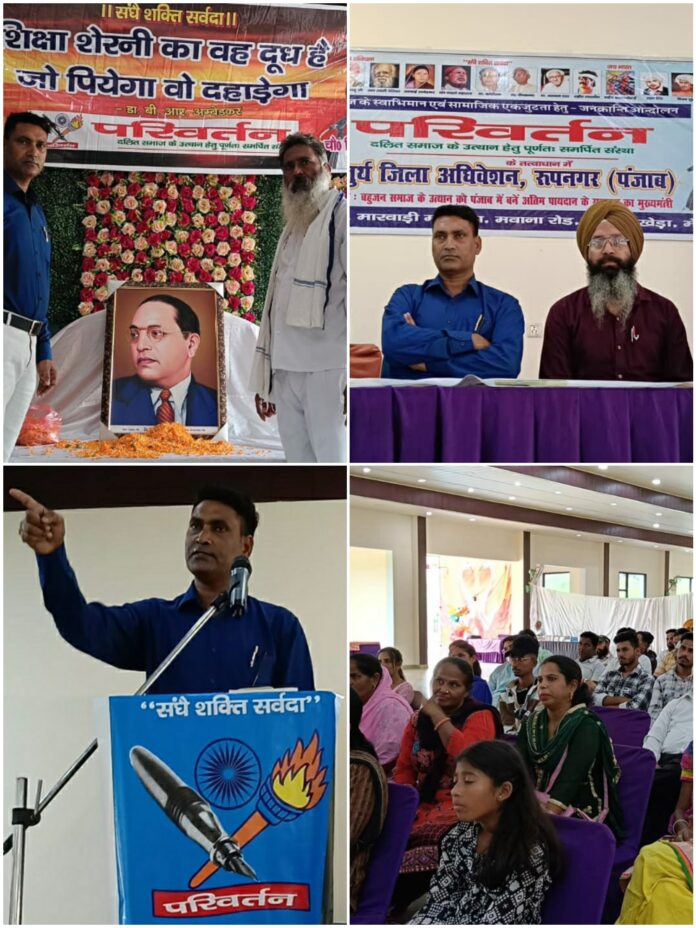 “बहुजन समाज के उत्थान हेतु पंजाब में बने अंतिम पायदान के समुदाय का मुख्यमंत्री” विषय को लेकर कोहिनूर पैलेस,नूपुर बेदी जिला रूपनगर(पंजाब)में परिवर्तन संस्था द्वारा चतुर्थ जिला अधिवेशन का आयोजन किया गया। जिसकी अध्यक्षता केंद्रीय अध्यक्ष वेदवीर सिंह आदिवासी ने की तथा संचालन पंजाब स्टेट इंचार्ज अल सिमरन ने किया। इस अवसर पर बतौर मुख्य अतिथि संस्था प्रमुख चौधरी विनोद अंबेडकर की गरिमामई उपस्थिति रही। इस अवसर पर पंजाब प्रांत अध्यक्ष जसविंदर कुमार, राजस्थान प्रदेश अध्यक्ष सोहन चांवरिया,विशेष सहयोगी कुमारी पालक एवं राजकुमार विशिष्ट अतिथि रहे।