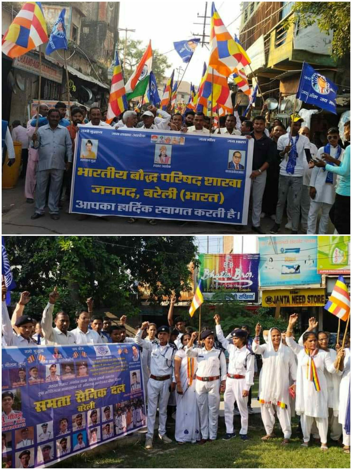 आज 24 अक्तूबर को भारतीय बौद्ध परिषद के तत्वाधान में आयोजित सम्राट अशोक धम्म विजय दशमी एवम् डॉक्टर भीमराव अंबेडकर धम्म दीक्षा समारोह बहुत ही धूम धाम से बनाया गया। कार्यक्रम में सभी धम्म उपासक/उपासिकाओ ने सम्राट अशोक धम्म विजयदशमी शोभा यात्रा में प्रसन्न होकर भाग लिया और खासकर हमारे समाज की जागरूक युवा पीढ़ी ने बाबा साहब और महा पुरुषों के जीवन पर बने गानों पर समाज को जागरूक करने का काम किया। अमेठी से आई मिशन गायक बहन मालती अंबेडकर ने मिशन के गानों के माध्यम से समाज को जागरूक किया, भिक्षु संघ ने अपनी धम्म देशनाओ से कार्यक्रम में उपस्थित सभी लोगों को लाभान्वित किया। प्रबुद्ध महिला संघ बरेली की जनपद शाखा अपनी पूरी मिशन टीम के साथ कार्यक्रम में शामिल हुई, समता सैनिक दल के कर्मठ सिपाही शोभा यात्रा की कमान संभाल कर चलते रहें। हमारे समाज के सभी बुद्ध जीवी कार्यक्रम में शामिल हुए,समाज के अनेक ग्रामों/शहरों से शोभा यात्रा में समाज के महापुरषों पर आधारित झाकियां लेकर आए और शोभा यात्रा को भव्य रूप दिया एवम् आयोजन के लिए जिन धम्म बंधुओ ने धम्म दान दिया। भारतीय बौद्ध परिषद जनपद शाखा बरेली के सभी सदस्यों द्वारा उन सभी धम्म बंधुओ का बहुत बहुत साधुवाद, आभार और मंगलमय धम्म कामनाएं व्यक्त किया।