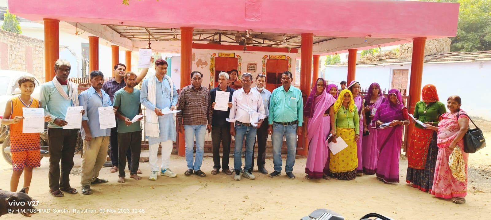 सूरौठ में पंचायत प्रारंभिक शिक्षा अधिकारी सोहन सिंह मीणा एवं बूथ अवेयरनेस ग्रुप के सदस्यों ने गुरुवार को कस्बे में घर-घर जाकर मतदाताओं से संकल्प पत्र भरवाए तथा लोगों को शत प्रतिशत मतदान करने के लिए जागरूक किया। इस अवसर पर चुनाव आयोग की ओर से दिव्यांग मतदाताओं के लिए मतदान हेतु उपलब्ध सुविधाओं के बारे में अवगत कराया गया। बीएजी ग्रुप के अध्यक्ष सोहन सिंह मीणा, बूथ लेवल अधिकारी हरि मोहन पुष्पद, अमित कुमार गोयल, बलवीर कुमार, सुपरवाइजर वीरेंद्र पाराशर, ग्राम विकास अधिकारी जगदीश जाट, सहायक सचिव विनोद सैन, आंगनवाड़ी सुपरवाइजर सुमन लता जैन, आंगनवाड़ी कार्यकर्ता विजय लक्ष्मी तिवाड़ी, सुनीता शर्मा, शीला मीणा, सुनीता मीणा, मिथिलेश गुप्ता, सुमन गुप्ता, सुनीता शर्मा, बबीता घुनावत आदि ने कस्बे के गोठिया के पुरा पर पहुंच कर लोगों को मतदान का महत्व बताया तथा 25 नवंबर को आवश्यक रूप से मतदान करने की अपील की। बीएलओ एवं अन्य सदस्यों ने गोठिया के पुरा में घर-घर जाकर 25 नवंबर को आवश्यक रूप से मतदान करने के संकल्प पत्र भरवाए। इस मौके पर बीएलओ हरिओम पुष्पद ने दिव्यांग मतदाताओं के लिए उपलब्ध की गई सुविधाओं के बारे में जानकारी लेने के लिए चुनाव आयोग की एप के बारे में अवगत कराया।