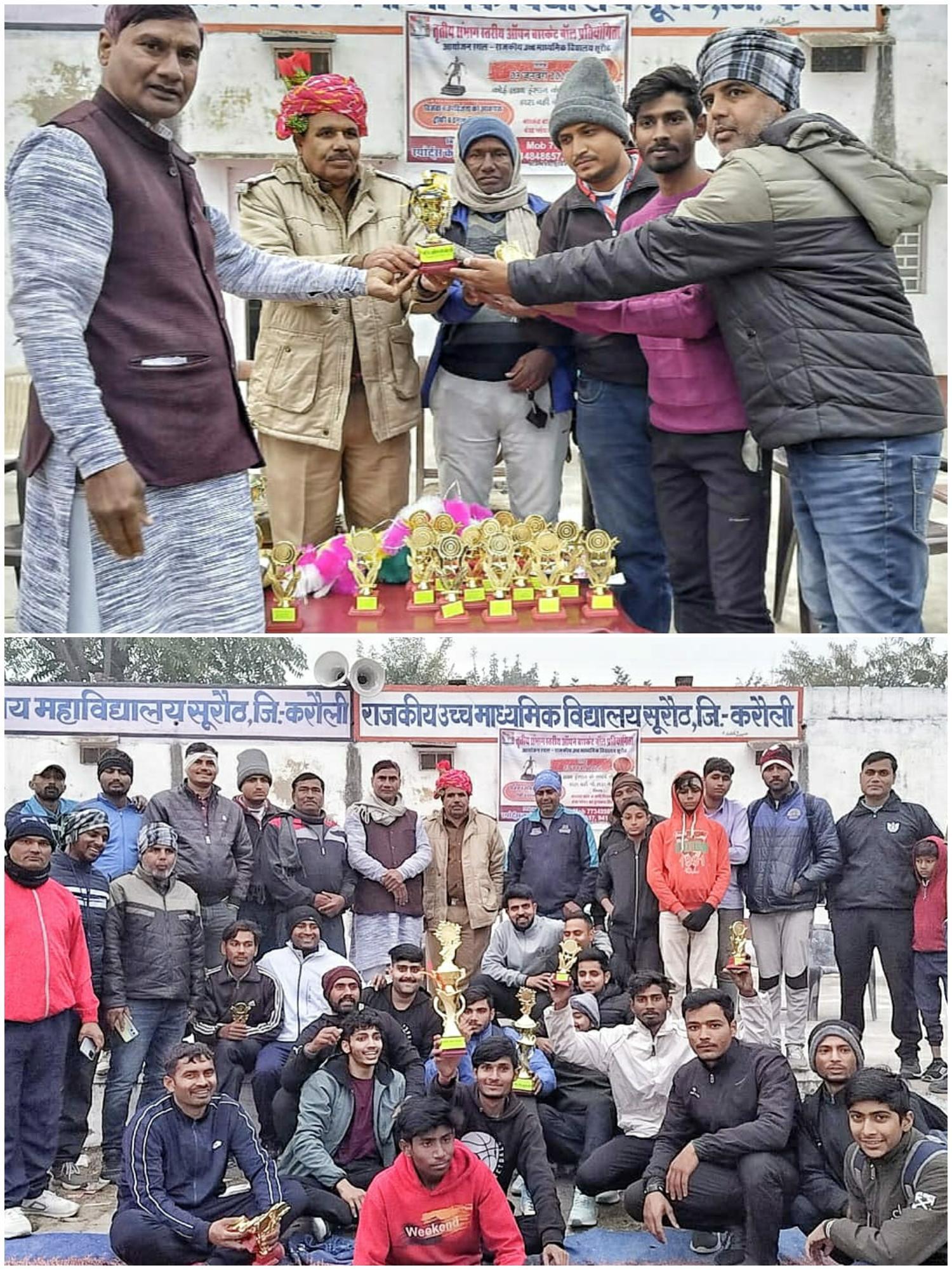 सूरौठ तहसील मुख्यालय स्थित राजकीय उच्च माध्यमिक स्कूल के खेल मैदान पर आयोजित हुई संभाग स्तरीय बास्केटबॉल प्रतियोगिता का गुरुवार को विधिवत रूप से समापन किया गया। 2 दिन तक चली प्रतियोगिता का फाइनल मैच भरतपुर एवं धौलपुर की टीम के बीच खेला गया जिसमें धौलपुर की टीम चैंपियन रही। प्रतियोगिता के समापन कार्यक्रम के मुख्य अतिथि जिला शूटिंग बॉल संघ के मुख्य संरक्षक व रिटायर्ड शारीरिक शिक्षक रामनिवास मीणा थे तथा सूरौठ थाना प्रभारी पंजाब सिंह विशिष्ट अतिथि के रूप में उपस्थित रहे। इस अवसर पर अतिथियों ने विजेता एवं उपविजेता टीम के खिलाड़ियों को शील्ड, पुरस्कार सामग्री एवं इनाम राशि भेंट कर सम्मानित किया। प्रतियोगिता आयोजन कमेटी के अध्यक्ष विश्राम मीणा ने बताया कि सूरौठ स्पोर्ट्स क्लब के तत्वाधान में आयोजित हुई बास्केटबॉल प्रतियोगिता में भरतपुर संभाग की कई टीमों ने भाग लिया। प्रतियोगिता का फाइनल मुकाबला बेहद रोमांचक हुआ जिसमें धौलपुर की टीम ने भरतपुर को 48-46 अंकों के अंतर से जीत दर्ज की। फाइनल मैच में रेफरशिप शारीरिक शिक्षक मदन मोहन नापित एवं गोविंद मीणा ने की। इसके अलावा शारीरिक शिक्षक राजेश मीणा, विनीत मीणा एवं राजेंद्र मीणा ने स्कोरर की भूमिका निभाई। टूर्नामेंट के सर्वश्रेष्ठ खिलाड़ी का अवार्ड भरतपुर के प्रिंस चौधरी को दिया गया। समापन कार्यक्रम में मंच संचालन वरिष्ठ शारीरिक शिक्षक भूपाल सिंह मीणा ने किया। इस अवसर पर शारीरिक शिक्षक गब्बर सिंह, गोविंद मीणा, मदन मोहन नापित, राजेश मीणा, हेमराज मीणा, प्रशांत शर्मा, गजेंद्र मीणा, अजय मीणा, नरेश मीणा, राधेश्याम मीणा आदि ने अतिथियों का साफा व माला पहनाकर सम्मान किया। कार्यक्रम में मुख्य अतिथि मीणा ने कहा कि हार और जीत खेल के हिस्से हैं इसलिए खिलाड़ियों को पराजय से हताश नहीं होना चाहिए तथा अगली प्रतियोगिताओं में फिर से जीत का प्रयास करना चाहिए। थाना प्रभारी पंजाब सिंह ने कहा कि शरीर को फिट बनाए रखने के लिए खेल बहुत जरूरी है।