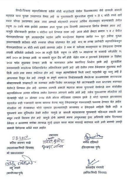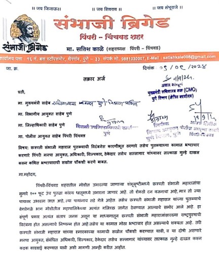 दरम्यान, अलीकडेच मालवण येथे छत्रपती शिवरायांच्या पुतळ्याच्या प्रकरणामुळे संपूर्ण महाराष्ट्रात संतापाचे वातावरण आहे. त्याच धर्तीवर पिंपरी चिंचवड मध्येही छत्रपती संभाजी राजांची होत असलेली विटंबना ही अत्यंत खेदाची बाब आहे. यातून छत्रपती संभाजी महाराजांच्या पुतळ्याची पवित्र्यता राखली जात नसून त्यांची विटंबना होत असल्याचे निष्पन्न झाले आहे. यामुळे छत्रपती संभाजी महाराज पुतळ्याची विटंबनेस कारणीभूत ठरणारे तसेच पुतळ्याच्या कामात भ्रष्टाचार करणारे पिंपरी मनपा आयुक्त व इतर दोषी अधिकारी, शिल्पकार, ठेकेदार तसेच सल्लागार यांच्यावर तात्काळ गुन्हे दाखल करून कथित भ्रष्टाचाराची सखोल चौकशी करण्याची मागणी संभाजी ब्रिगेडच्या वतीने करण्यात आलेली आहे. निवेदनावर संभाजी ब्रिगेडचे शहराध्यक्ष सतीश काळे, जिल्हाध्यक्ष गणेश दहिभाते, कार्याध्यक्ष लहू लांडगे, जिल्हा सचिव गणेश कुंजीर, शहर सचिव रावसाहेब गंगाधरे यांच्या स्वाक्षऱ्या आहेत.