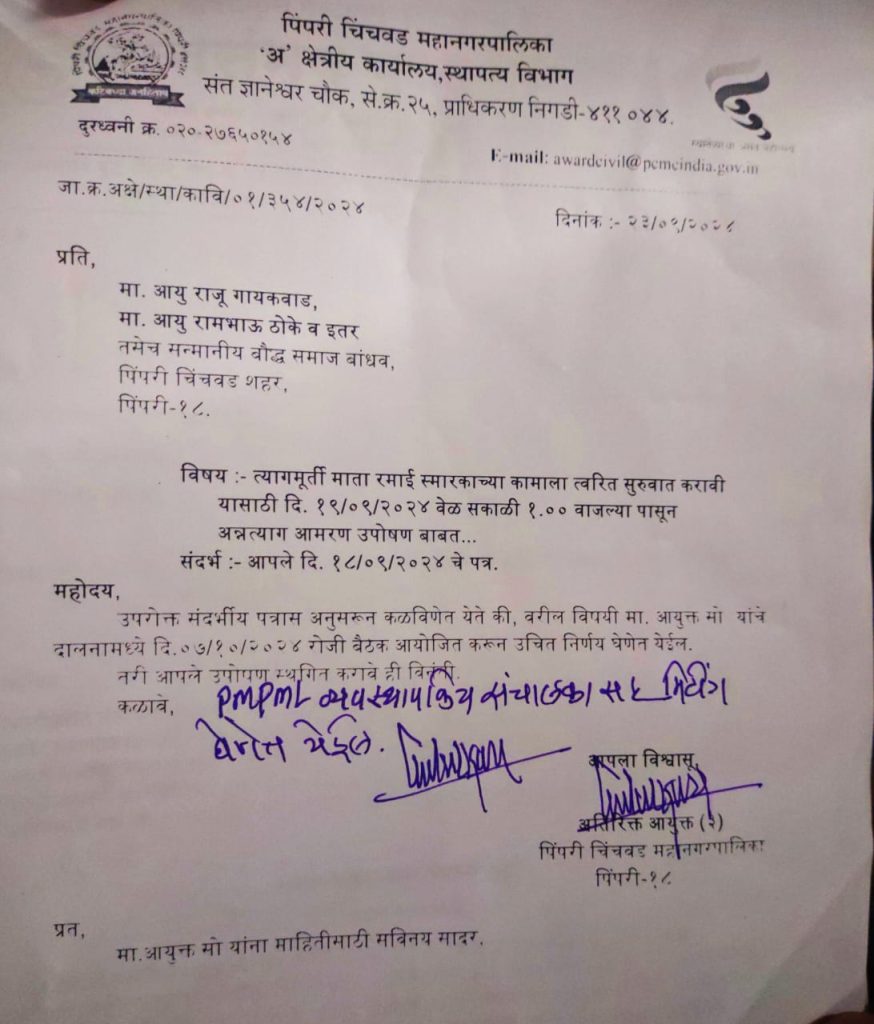 प्रतिनिधी पिंपरी चिंचवड दि. २५ सप्टेंबर २०२४ गेली अनेक वर्ष पक्ष संघटना आणि स्मारक समित्या यांनी पाठपुरावा करून सतत त्याग मूर्ती माता रमाई भिमराव आंबेडकर यांच्या स्मारका विषयी लढा चालू होता. परंतु पिंपरी चिंचवड महानगरपालिका प्रशासन आश्वासन देऊन दिलेल्या आश्वासनाचे पालन करत नव्हते परंतु पिंपरी चिंचवड शहरातील सर्व पक्ष संघटना धार्मिक संस्था बुद्धविहार समित्या यांचे सर्व सदस्य एकत्र येऊन बौद्ध समाज बांधव पिंपरी चिंचवड शहर या नावाने “आमरण उपोषण” करण्याचे ठरवले व या उपोषणास लाभलेले उपोषणकर्ते राजू गायकवाड व रामभाऊ ठोके यांनी आमरण उपोषण करण्याचे ठरवले व तसा पूढाकार ही घेतला.