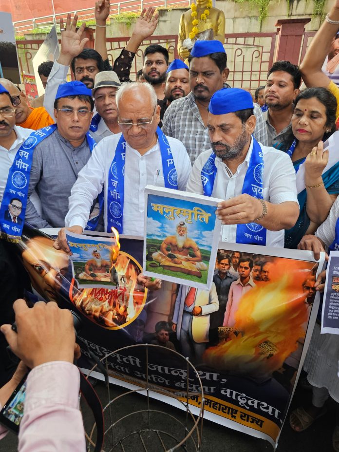 न्यायमूर्ति बी. जी कोळसे पाटिल की उपस्थिति में मनुस्मृति का सामूहिक दाह संस्कार; राज्य सरकार को लिया आडेहातनागपूर दि. २५ सितंबर २०२४छत्रपति शिवाजी महाराज और डॉ. बाबासाहेब अंबेडकर इनके नाम पर वोट मांगने वाली और स्कूली बच्चों की किताबों से ही शिवाजी महाराज और डॉ. बाबासाहब अंबेडकर को हद्दपार करने की साजिश बीजेपी के नेतृत्ववाली राज्य की शिंदे सरकार ने रची है, ऐसा आरोप राज्य के पूर्व मंत्री एवं उत्तर नागपुर के विधायक डॉ. नितिन राऊत द्वारा किया। राज्य में मानवतावादी विचारों की असंवैधानिक सरकार है और उन्हें बाहर करने का समय आ गया है। कामठी रोड स्थित बाबासाहब अंबेडकर इंटरनेशनल कन्वेंशन सेंटर के सामने बाबासाहब अंबेडकर के पुतले के सामने मनुस्मृति जलाते समय बोल रहे थे।कांग्रेस नेता और लोकसभा में विपक्ष के नेता राहुल गांधी को लगातार बीजेपी नेताओं से जान से मारने की धमकी मिल रही है। आरएसएस ने जातिगत जनगणना का खुलकर विरोध किया है। बीजेपी और आरएसएस को जातीय जनगणना नहीं चाहते। इस दौरान डॉ. राऊत ने कहा कि वे दलितों, पिछड़ों, आदिवासियों को उनका हक नहीं देना चाहते।राज्य में महिलाओं के खिलाफ यौन हिंसा में लगातार बढ़ोतरी हो रही है। सबसे ज्यादा बलात्कार के मामले मुंबई में दर्ज किए गए हैं, उसके बाद मुख्यमंत्री का शहर ठाणे है। महाराष्ट्र में कानून व्यवस्था के तीन तेरा बज चुके हैं। इस समय डॉ. राऊत ने आरोप लगाते हुए कहा कि, मुख्यमंत्री और दोनों उपमुख्यमंत्री कानून-व्यवस्था संभालने में विफल रहे हैं। इस समय न्यायमूर्ति बी. जी. कोळसे पाटिल और डॉ. बाबासाहेब अम्बेडकर सोशल फोरम के कार्यकारी अध्यक्ष राजेश लाडे मुख्य रूप से उपस्थित थे।राज्य में भाजपा के नेतृत्ववाली सरकार राज्य में मानवतावाद और रंगभेद के पुराने सड़े-गले विचारों को बढ़ावा देने की कोशिश कर रही ऐसा आरोप लगाते हुए उन्होंने मनुस्मृति की होली जलाई। मनु ने मनुस्मृति में चतुर्वर्ण की वकालत की थी। मनु ने चतुर्वर्णों की पवित्रता बनाये रखने की शिक्षा दी थी। इससे ही जाति व्यवस्था को बढ़ावा मिला है, मनु ने जातिव्यवस्था के बीज बोए हैं। हालाँकि, राज्य के शासक महाराष्ट्र में मनु के राज्य और चातुर्वण्य व्यवस्था को फिर से स्थापित करना चाहते हैं, ऐसा डॉ. राऊत ने कहा है।इस अवसर पर गोपाल राजवाड़े, राहुल घरड़े, रूपराज गौरी, विजया हजारे, कुणाल खोब्रागड़े, सचिन वासनिक, दीपा गावंडे, कल्पना द्रोणकर, संदीप सिंह, स्वप्निल, राहुल शेंडे, संतोष खडसे, अभिजीत सांगोळे, निशिगंधा वाघमारे, चेतन तरारे सहित बड़ी संख्या में नागरिक मौजूद थे।