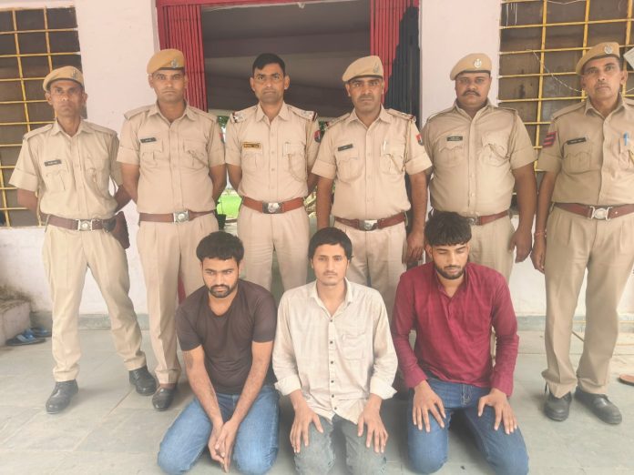 कस्बा सूरौठ के मुख्य बाजार में 19 जून की रात्रि को सर्राफा व्यवसायी चंदन सोनी की दुकान की शटर तोड़ कर की गई चांदी के आभूषणों की चोरी की वारदात का पुलिस ने सोमवार को पर्दाफाश कर दिया है। पुलिस ने दुकान में चोरी करने वाले तीन युवकों को गिरफ्तार कर उनसे चुराए गए जेवरातों को बरामद कर लिया है। गिरफ्तार किए गए आरोपी श्री महावीर जी थाने के गांव चांदनगांव निवासी ओमेन्द्र सिंह गुर्जर, बालाघाट थाने के गांव निवासी अर्जुन गुर्जर एवं बयाना सदर थाने के गांव नंगला ज्ञानी निवासी मनु गर्जर है। तीनों युवकों से पुलिस कड़ी पूछताछ कर रही है। थाना प्रभारी महेश कुमार मीणा ने बताया कि 19 जून की रात्रि को मोटरसाइकिल पर सवार होकर आए तीन नकाबपोश बदमाश कस्बे के मुख्य बाजार में स्थित सर्राफा व्यवसायी चंदन सोनी की दुकान की शटर तोड़ कर चांदी के आभूषणों को चुरा ले गए थे। चोरी की घटना सीसीटीवी कैमरे में कैद हो गई थी। इस मामले में सर्राफा व्यवसायी चंदन सोनी की ओर से थाने में चोरी की रिपोर्ट दर्ज करवाई गई थी। रिपोर्ट में उल्लेख किया गया कि 19 जून की रात्री को करीब एक बजे के करीब 3 नकाबपोश बदमाशों ने दुकान की शटर को लोहे की सरिया से तोड दिया तथा काउंटर में रखी चांदी की अंगूठियों, घुंघरू, तीन जोड़ी तोडिया, 2 चुटकी की थैली, चांदी के ताबीज, पातरी, माला, छत्तर, पायजेब, कोंदनी सहित करीब साढे 3 किलो वजन के चांदी के आभूषणों को चुरा ले गए। तीनों बदमाश स्पलेन्डर मोटरसाईकिल पर सवार होकर नकाब बांध कर आए थे। जिनमें एक जने के हाथ में लोहे की लग्गी थी। चोरों ने सबसे पहले सर्राफा व्यवसायी की दुकान के सामने उजाले के लिए लगाए गये वल्व को बंद किया तथा बाद में चोरी की घटना को अंजाम दिया। पुलिस ने चोरों की तलाश में आसपास के सभी सीसीटीवी कैमरे खंगाले तथा संदिग्धों की पहचान हेतु सोशल मीडिया पर फोटो एवं मैसेज वायरल किये। 25 अगस्त को श्रीमहावीर जी थाने के कांस्टेबल सुमेर सिंह को सूरौठ में हुई चोरी के मामले में कुछ इनपुट मिले। थाना सूरौठ के कांस्टेबल अमीर सिंह ने कांस्टेबल सुमेर सिंह के बाटसएप नम्बर पर सी सी टी वी फुटेज व संदिग्धों के विडियो भेजे गये। दोनो कानिस्टेबलो ने अपनी अपनी आसूचना व इनपुटो का आपस में साझा किया। सी सी टी वी फुटेज में दिखाई दे रहे संदिग्ध की पहचान ओमेन्द्र सिंह गुर्जर निवासी चांदन गांव थाना श्रीमहावीरजी के रूप में की गई। तत्पश्चात दोनो कानिस्टेबलो ने उच्चाधिकारियों को अवगत कराया। जिला पुलिस अधीक्षक बृजेश ज्योति उपाध्याय के निर्देश पर थानाधिकारी महेश कुमार मीणा के नेतृत्व में थाना सूरीठ से एक पुलिस टीम तथा थानाधिकारी श्री महावीरजी थाना अधिकारी कैलाश चन्द के नेतृत्व में थाना श्रीमहावीरजी से एक स्पेशल टीम गठित की गई