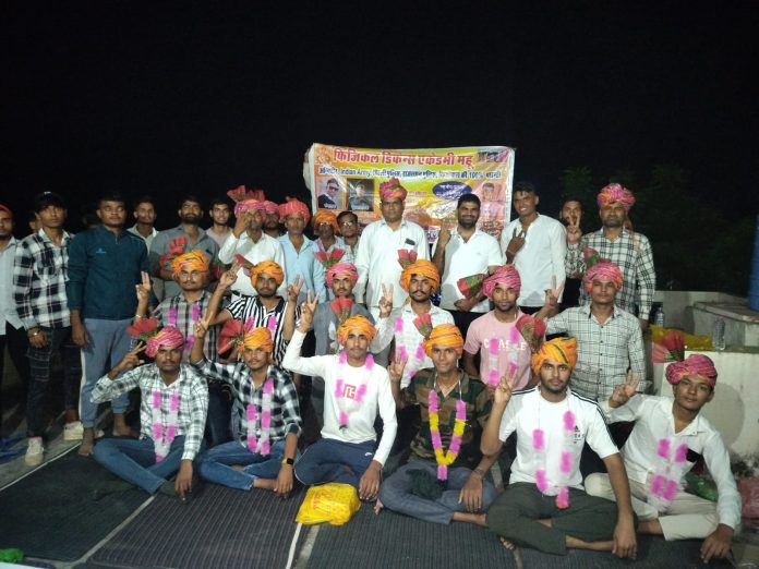 हिण्डौन। फिजिकल डिफेंस एकेडमी महू के संस्थापक नाहर सिंह सोलंकी व कोच बीकेश सोलंकी ने बताया कि आर्मी भर्ती 2024 में चयनित हुए अभ्यर्थीयो का शुक्रवार को महू डिफेंस एकेडमी कि ओर से सम्मान समारोह आयोजित हुआ। समारोह के मुख्य अतिथि युवा जाट महासभा करौली जिलाध्यक्ष करतार सिंह चौधरी धंधावली व विशिष्ट अतिथि गजानन सोलंकी ncpकोचिंग , मनीष शर्मा गुरु कृपा, वीकेश सोलंकी गुरु कृपा, नरेश सोलंकी एस आर कंप्यूटर, केपी गुर्जर पी टी आई, विजय सोलंकी , रेवत सिंह ठेकेदार रहे और अध्यक्षता एकेडमी के व्यवस्थापक हाकिम सिंह सोलंकी ने की । समारोह में आर्मी भर्ती में चयनित हुए सभी अभ्यर्थियों का माला व साफा पहनकर एवं मैडल देकर सम्मानित किया गया। चयनित हुए अभ्यर्थी गोलू बेरखेड़ा, सुल्तान महू, कन्हैया महू, दीपक क्यारदाकला, संतोष ढहरा, सोफियान गद्दीपुरा, विशाल महू, अवदेश लहचौडा, सोनू लहचौडा, सोरभ पाली, अनूप करई, देवेन्द्र रेवई, हरिओम रेवई, पुष्पेन्द्र तिघरिया, विष्णु तिघरिया, सुमित महूदलालपुर, लोकेश पाली, गज्जू राराशाहपुर, विकास राराशाहपुर, मानवेंद्र महूखास, रूपन महूखास, टीका गुर्जर, रीझवास, केशव शेरपुर को सम्मानित किया गया। एकेडमी में फिजिकल पास कुल 57 बच्चे थे जिनमें से फाइनल सलेक्शन 23 बच्चों का हुआ है इस मौके पर सभी अभ्यर्थियों ने एक दूसरे को मिठाई खिलाकर आशीर्वाद प्राप्त किया गजानन सोलंकी ने सभी विद्यार्थियों सभी शिक्षार्थियों को उनके उज्जवल भविष्य की कामना करते हुए धन्यवाद ज्ञापित किया।