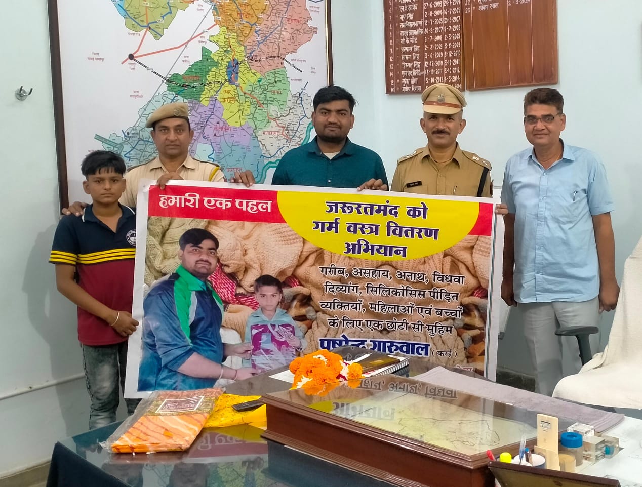 करौली/ अतिरिक्त पुलिस अधीक्षक गुमना राम ने सर्दियों में जरूरतमंदों को वस्त्र वितरण अभियान का पोस्टर विमोचन किया गया। एएसपी ने बताया कि सर्दियों में जरूरतमंदों की मदद जरूर करनी चाहिए सामाजिक कार्यकर्ता पुष्पेन्द्र गारूवाल ने बताया कि इस गरीब असहाय, जरुरतमन्दो को गर्म वस्त्र वितरण किया जाएगा।इस मौके पर रीडर शिवसिंह, बाबूजी भूपेन्द्र कांस्टेबल पुष्पेन्द्र, कांस्टेबल सिकंदर, कांस्टेबल रामकिशोर, कांस्टेबल संतोष लाल गनमैन प्रधान , प्रदीप संदीप आदि मौजूद रहे।