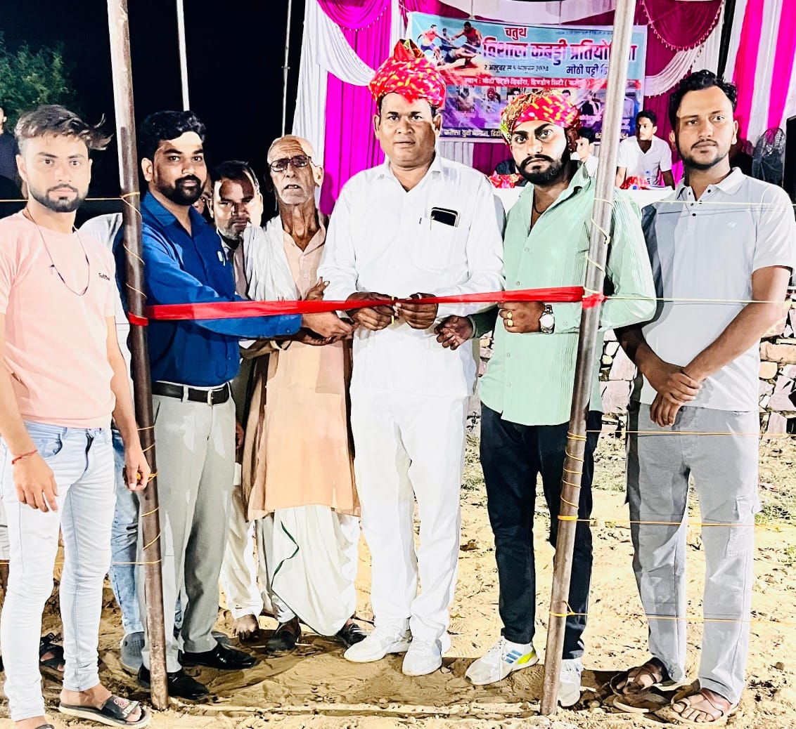 गांव ढिंढोरा में चतुर्थ विशाल कबड्डी प्रतियोगिता का शुभारंभ हुआ आयोजित कमेटी के सदस्य दुर्गा डागुर ने बताया कि प्रतियोगिता उद्घाटन समारोह के मुख्य अतिथि जाट समाज चौरासी के मीडिया प्रभारी व युवा जाट महासभा करौली के जिलाध्यक्ष करतार सिंह चौधरी धंधावली , वीर तेजाजी वैलफेयर फाउंडेशन के संस्थापक अजय चौधरी, डॉ हेमन्त वर्मा, रामभरोसी चौथईया रहे । प्रतियोगिता का शुभारंभ अतिथियों द्वारा फीता काट किया गया । प्रतियोगिता में दो दर्जनों अधिक टीमे भाग ले रही हैं । प्रथम मैच का टोस मुख्य अतिथि करतार सिंह चौधरी के द्वारा कराया गया जिसमें खेड़ीहैवत ने टोस जीता । प्रथम मैच जूनियर टीम खेडीहैवत व जूनियर टीम ढिंढोरा के बीच हुआ जिसमें जूनियर टीम ढिंढोरा ने 30 पोइंट से जूनियर टीम खेडीहैवत को हराकर जीत हासिल की । करतार चौधरी ने सभी टीमों से खेल को खेल की भावना से खेलने व खेल में अनुशासन बहुत जरूरी है इस लिए खेल में अनुशासन बनाए रखने के लिए कहा और डॉ हेमन्त शर्मा ने कहा कि खेलने से शरीर स्वस्थ रहता है और एम्पायर का निर्णय सर्वमान्य होता है इसलिए निर्णय का सम्मान करें । इस अवसर पर जयसिंह डागुर, गंगा डागुर, पप्पू डागुर, राकेश डागुर, अमित डागुर , शैलेन्द्र डागुर मौजूद रहे।