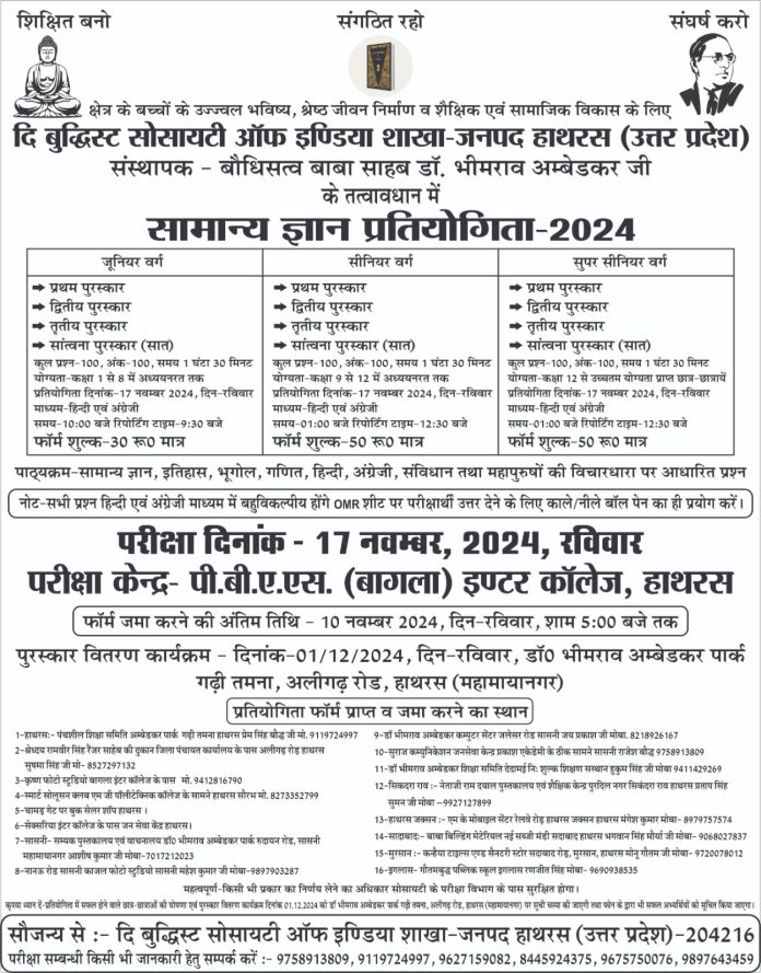 हाथरस क्षेत्र के बच्चों के उज्जवल भविष्य श्रेष्ठ जीवन निर्माण और शैक्षिक व सामाजिक विकास के लिए द बुद्धिस्ट सोसाइटी ऑफ़ इंडिया शाखा हाथरस के सौजन्य से सामान्य ज्ञान प्रतियोगिता का आयोजन 17 नवंबर 2024 दिन रविवार को पी बी ए एस (बागला) इंटर कॉलेज हाथरस में किया जाएगा। जूनियर सीनियर और अपर सीनियर वर्गों में ये परीक्षा आयोजित की जाएगी। जिसमें 100 अंको में हिंदी अंग्रेजी माध्यम से सामान्य ज्ञान प्रतियोगिता में इतिहास भूगोल गणित हिंदी अंग्रेजी संविधान तथा महापुरुषों के विचारधारा पर आधारित100 प्रश्नों को डेढ़ घंटे में हल करना होगा। प्रतियोगिता फॉर्म जमा करने की अंतिम तिथि 10 नवंबर है प्रतियोगिता फॉर्म निर्धारित किए गए स्थान से लिए व जमा किए जा सकते हैं। प्रतियोगिता में सफल होने वाले छात्रों को 1 दिसंबर दिन रविवार को गढ़ी तमन्ना हाथरस स्थित अंबेडकर पार्क में आयोजित होने वाले पुरस्कार वितरण एवं सम्मान कार्यक्रम में पुरस्कृत भी किया जाएगा। यह जानकारी देते हुए बुद्धिस्ट सोसाइटी के जिलाध्यक्ष राजेश बौद्ध ने बताया कि ये प्रतियोगिता जूनियर वर्ग की परीक्षा सुबह 10:00 बजे से प्रारंभ होगी और सीनियर अपर सीनियर दोपहर 01 बजे से होगी। प्रतियोगिता में भाग लेने के लिए फार्म शुल्क जूनियर वर्ग के लिए ₹30 तथा सीनियर एवं अपर सीनियर वर्ग के लिए फार्म शुल्क ₹50 रखा गया है। हाथरस जनपद में हाथरस, सादाबाद, सिकंदराराऊ, सासनी, मुरसान हाथरस जंक्शन आदि विभिन्न स्थानों पर आवेदन पत्र वितरण केन्द्र बनाएं गए हैं। छात्र जिस स्थान से आवेदन पत्र प्राप्त करे उसी स्थान पर जमा कर सकते हैं। इस परीक्षा में किसी भी वर्ग किसी भी उम्र कक्षा या किसी भी बोर्ड के छात्र छात्राए आवेदन कर सकते हैं।