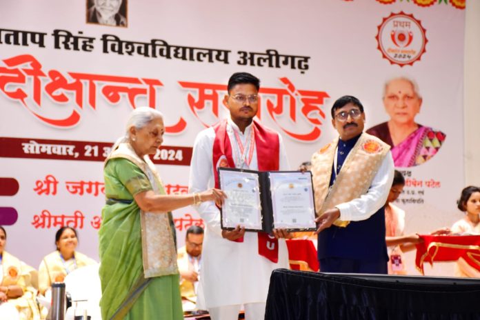 प्रहलाद कुमार पुत्र अमरलाल जाटव मिल्कीपुरा (ढिंढोरा) निवासी को एग्रोनॉमी ( कृषि विज्ञान ) एम. एस. सी. में सर्वोच्च अंक प्राप्त करने पर राजा महेंद्र प्रताप सिंह राज्य विश्वविद्यालय अलीगढ़ ( उत्तरप्रदेश) के प्रथम दीक्षांत समारोह में उपराष्ट्रपति माननीय जगदीश धनकड़ की गरिमामय उपस्थिति में माननीय राज्यपाल आनंदीबाई पटेल एवं कुलपति प्रोफेसर चंद्रशेखर के द्वारा स्वर्ण पदक प्रदान किया गया । प्रहलाद कुमार ने इस उपलब्धि का श्रेय माता-पिता एवं गुरुजनों को दिया ! रिंकू कुमार खेडी हेवत ने पहलाद कुमार के उज्जवल भविष्य की कामना करते हुए उनको बधाई एवं शुभकामनाएं ज्ञापित की है।