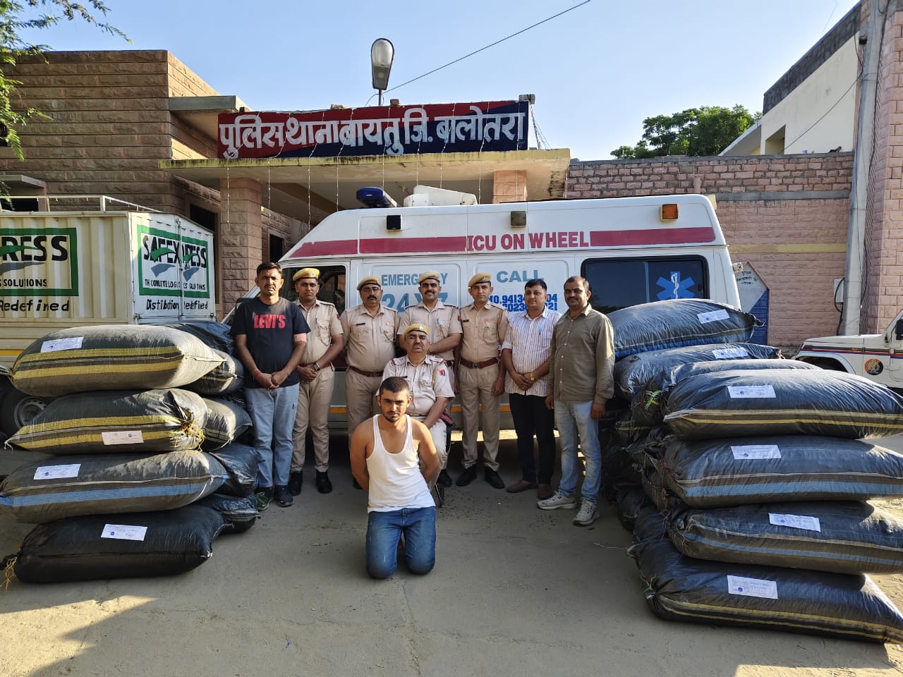 बाड़मेर_पुलिस थाना बायतु द्वारा की जा रही नाकाबंदी को तोड़कर भागे एम्बुलेंस चालक को सरहद कोसरिया में एम्बुलेंस सहित उसमें भरे 679.655 किलोग्राम अवैध डोडा पोस्त कीमतन 50 लाख रुपए बरामद कर आरोपी भोमाराम पुत्र रुखाराम जाति जाट (मायला) निवासी जाखड़ों की ढाणी, सनावड़ा पुलिस थाना सदर बाड़मेर को गिरफ्तार करने में सफलता हासिल की है, प्राइवेट एम्बुलेंस की आड़ में की जा रही थी मादक पदार्थ की तस्करी।