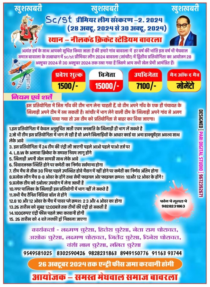 सांचौर – हर वर्ष की भांति इस वर्ष भी मेघवाल समाज बावरला के तत्वाधान में SC/ST प्रीमियर लीग 2024 का आयोजन 28 अक्टूबर से 30 अक्टूबर 2024 तक किया जा रहा है। यह टूर्नामेंट बावरला (सांचौर) में द्वितीय बार आयोजित किया जा रहा है, जिसमें सभी खेल प्रेमियों को आमंत्रित किया गया है।इस आयोजन का मुख्य उद्देश्य SC/ST समुदाय के युवाओं को एक मंच प्रदान करना है, ताकि वे खेलकूद के माध्यम से अपनी प्रतिभा का प्रदर्शन कर सकें और आपसी सहयोग और भाईचारे को बढ़ावा दे सकें। टूर्नामेंट में SC/ST समुदाय के सभी युवा, कर्मचारी, व्यापारी, उद्योगपति, ठेकेदार और सामाजिक संगठनों से जुड़े लोग शामिल होंगे।इस टूर्नामेंट के आयोजकों का कहना है कि दीपावली के शुभ अवसर पर आयोजित यह टूर्नामेंट समुदाय के बीच मिलनसारिता और सौहार्द्र बढ़ाने का प्रयास है। मेघवाल अंबेडकर सेवा समिति सांचौर और मेघवाल युवा परिषद सांचौर भी इस आयोजन का समर्थन कर रही हैं।आयोजकों ने सभी से अनुरोध किया है कि वे इस आयोजन में तन, मन, धन से सहयोग करें और टूर्नामेंट को सफल बनाने में अपना योगदान दें। टूर्नामेंट में भाग लेने के लिए पंजीकरण की प्रक्रिया शुरू हो चुकी है और खेल प्रेमियों के लिए यह एक सुनहरा अवसर है।