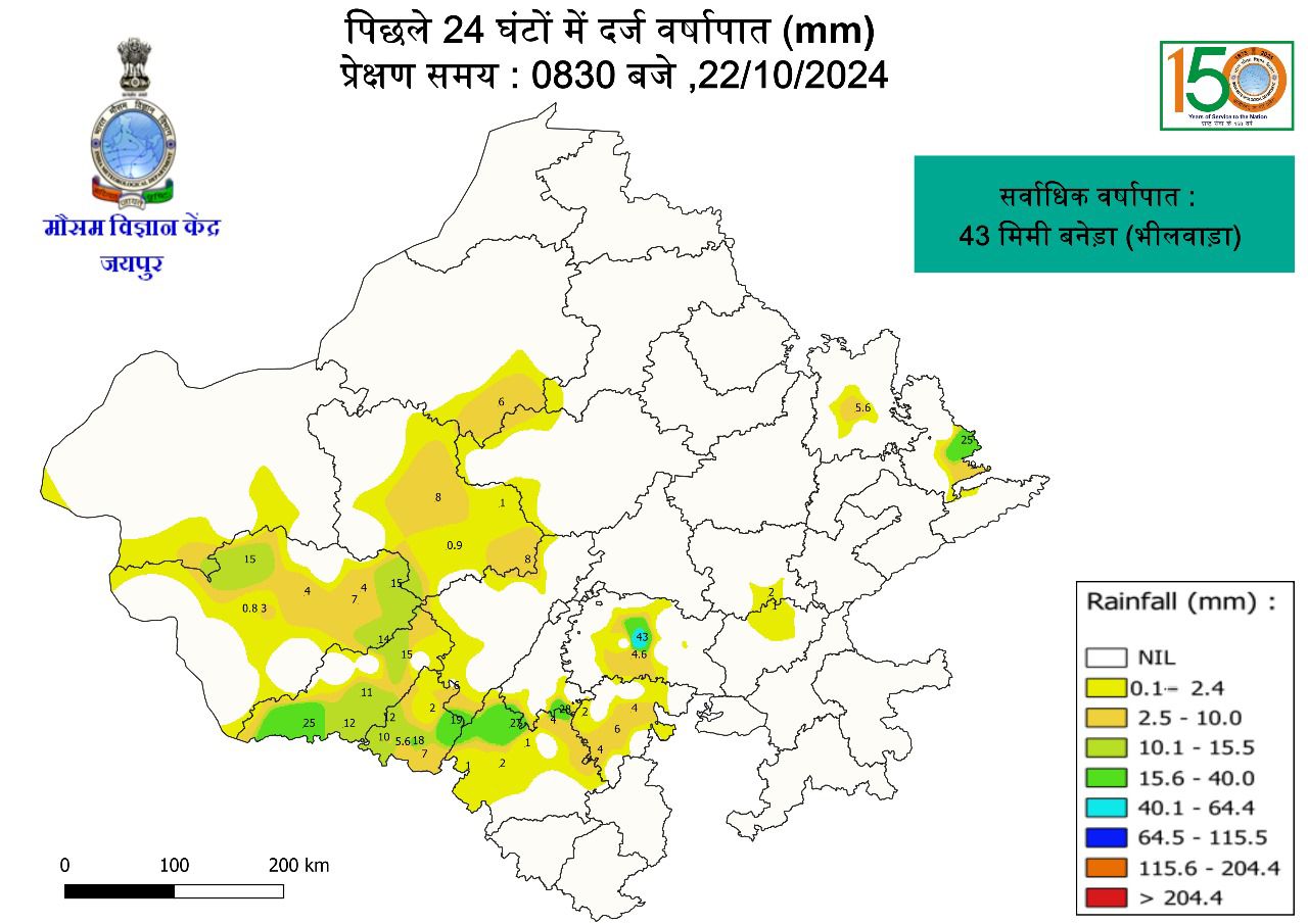 जालौर-राजस्थान में बेमौसम बारिश का दौर दूसरे दिन भी जारी रहा। भरतपुर, करौली, जयपुर, उदयपुर, बाड़मेर, अलवर, चूरू, माउंट आबू समेत कई शहरों में सोमवार को बादल छाने के बाद आंधी चली और बारिश हुई। वहीं कुछ इलाकों में ओले भी गिरे।पश्चिमी राजस्थान में सोमवार को हुई बारिश से तापमान में करीब 4 डिग्री तक गिरावट आई है। सबसे ज्यादा बारिश माउंट आबू में दर्ज की गई। पूर्वी राजस्थान के 4 जिलों में भी आज भी बारिश का अलर्ट हैसोमवार दोपहर बाद अचानक पश्चिमी राजस्थान के इलाकों में मौसम बदला। पिछले 24 घंटे के दौरान सबसे ज्यादा बरसात 7MM बरसात सिरोही के माउंट आबू एरिया में हुई।वहीं बाड़मेर, जैसलमेर, जालोर के एरिया में भी दोपहर को बादल छाए और कई जगह हल्की बारिश-बूंदाबांदी हुई। उदयपुर, चूरू, जयपुर में भी कई स्थानों पर हल्की बारिश हुई। भरतपुर, अलवर, धौलपुर के एरिया में तेज आंधी के साथ बारिश और कई जगह ओले भी गिरे।जयपुर शहर के कई इलाकों में दोपहर बाद मौसम बदला और कुछ देर के लिए बारिश हुई। जालोर में 30 मिनट तक हवा के साथ तेज बारिश हुई। इससे सड़कों पर पानी भर गया। जालोर में 40 किमी प्रति घंटा की रफ्तार से हवा चल रही हैपश्चिमी राजस्थान में पारा 4 डिग्री तक गिराथंडर स्ट्राम (बादल, बारिश, आंधी) होने के बाद प्रदेश के कई शहरों में दिन के तापमान में गिरावट हुई। जैसलमेर में कल दिन का अधिकतम तापमान 4 डिग्री गिरकर 35.1 डिग्री सेल्सियस पर दर्ज हुआ।जालोर में अधिकतम तापमान (2.3 डिग्री गिरकर) 35 डिग्री सेल्सियस, माउंट आबू में (3 डिग्री गिरकर) 24.4, बीकानेर में (1.6 डिग्री गिरकर) 37.4 और अलवर में (1.4 डिग्री गिरकर) 36.2 डिग्री सेल्सियस दर्ज हुआआज भी पूर्वी राजस्थान में बारिश का अलर्टमौसम विज्ञान केन्द्र जयपुर ने आज भी पूर्वी राजस्थान के भरतपुर, धौलपुर, अलवर सहित 4 जिलों के एरिया में दोपहर बाद आसमान में बादल छाने, कहीं-कहीं हल्की बारिश या बूंदाबांदी होने की संभावना जताई हैवहीं पश्चिमी राजस्थान के कुछ हिस्सों में भी आंधी-बारिश की गतिविधियां होने की संभावना है। शेष राजस्थान में मौसम साफ रहने और धूप निकलने की संभावना है !