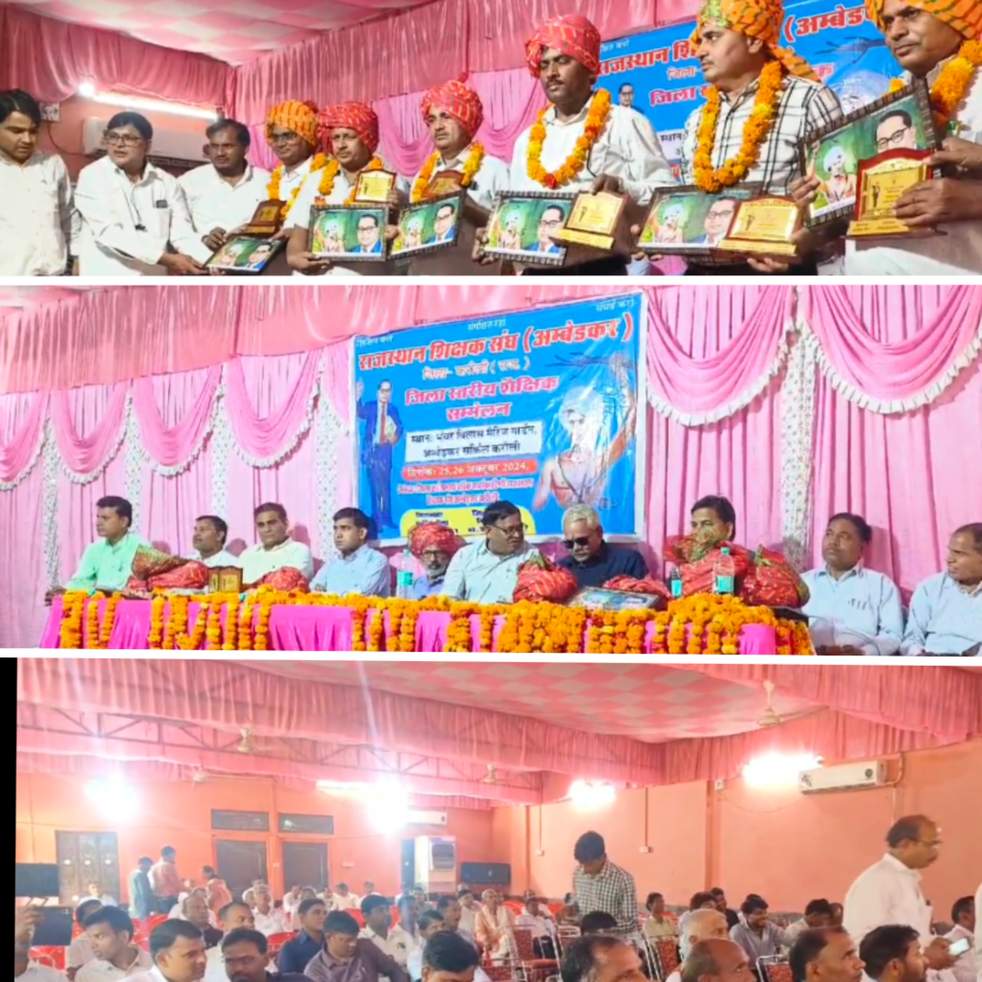 शिक्षक जीवन पर्यंत गुरु ही रहता है,शिक्षक समाज के मार्ग दर्शक, विधायक बनना बड़ी बात नहीं नेता बनना कठिन जनता के हृदय की भावना समझकर कार्य करना चुनौती ,सपोटरा विधायक हंसराज मीना 🧤शिक्षक संघ अम्बेडकर का जिला स्तरीय शिक्षक सम्मेलन का किया उद्घाटन, भंवर विलास पैलेस करौली में हुआ आयोजन,हंसराज मीना विधायक सपोटरा मुख्य अतिथि एवं सर्वेश कुमार गुप्ता सीबीईओ करौली,इंद्राज मीना सीबीआईओ मासलपुर,पूर्व सीबीईओ रामखिलाडी मीना,के एल मीना पूर्व प्राचार्य विशिष्ट अतिथि रहे,प्रवक्ता गंगाराम प्रजापत एवं महामंत्री विष्णु मंडल ने बताया कि मंच संचालन घनश्याम मीना ने किया,संरक्षक घनश्याम जाटव,शैलेंद्र बागौरिया सभाध्यक्ष,रूपसिंह मीना जिलाध्यक्ष,अमृत लाल छाबड़ा ने अतिथियों का माला साफा पहना कर स्मृति चिह्न भेट किया, अतिथियों ने अम्बेडकर की की प्रतिमा पर माल्यार्पण कर किया,शिक्षक सम्मेलन में घटते नामांकन एवं शिक्षकों के गैर शैक्षणिक कार्यों में ड्यूटी पर चिंता प्रकट की,कार्यक्रम को संबोधित करते हुए विधायक हंसराज मीना ने कहा कि गुरु का जीवन में सर्वोच्च स्थान है गुरुजी के मुख से निकली प्रत्येक बात का विद्यार्थी अनुसरण करते है वो ही जीवन की ऊंचाइयां तय करते हैं, उन्होंने कहा कि विधायक बनना कठिन नहीं जन नेता बनना चुनौती मै जन भावनाओं पर खरा उतरने की कोशिश करूंगा, सीबीईओ सर्वेश कुमार गुप्ता ने कहा कि शिक्षक अपने कर्तव्यों का ईमानदारी से पालन करें,शिक्षकों की समस्याओं का समाधान करने के लिए हम संकल्प वृद्ध,बच्चो को संस्कारवान बनाने की जिम्मेदारी शिक्षकों पर है,बच्चो को सामाजिक कुरीतियों एवं अंधविश्वास से दूर रखना है,गैर शैक्षणिक कार्यों से पढ़ाई बाधित होती है,शिक्षक अपने अधिकारों के लिए सतत संघर्ष करे ,सरकार तक अपनी मांगे रखे,कार्यक्रम में रामकेश मीना पूर्व संयुक्त निदेशक, रामखिलाड़ी जाटव, मुनेश मीना, रघुनाथ मीना,घनश्याम जाटव प्रधानाचार्य, शैलेंद्र कुमार बगौरिया,उदयसिंह जाटव प्रिंसीपल, साबाराम मीना प्रिंसीपल, रत्तीराम मीना पूर्व जिला अध्यक्ष, अमृत लाल छावड़ा पूर्व जिला अध्यक्ष, रूपसिंह मीना जिला अध्यक्ष, विष्णु मंडल जिला मंत्री, टीकाराम महावर कोषाध्यक्ष तेजाराम मीना, ब्लॉक अध्यक्ष करौली सियाराम जाटव ब्लॉक मंत्री, सुग्रीव बैरवा ब्लॉक अध्यक्ष मदरायल, कैलाश जाटव ब्लॉक अध्यक्ष हिंडौन, सविता कुमारी ब्लॉक अध्यक्ष मासलपुर, कैलाश मीना कोषाध्यक्ष करौली, वीना देवी ब्लॉक महामंत्री मासलपुर, सुरेश चंद कैन, पदम सिंह, कंवरलाल जाटव, तेजसिंह जाटव सुरेश कुमार ब्लॉक मंत्री हिंडौन, कुमेश कुमार, सुनील कुमार, रायसिंह,बनेसिंह, लक्ष्मी चंद मीना, रमेश चंद मीना, जसराम मीना, अमरसिंह लालावत ब्लॉक