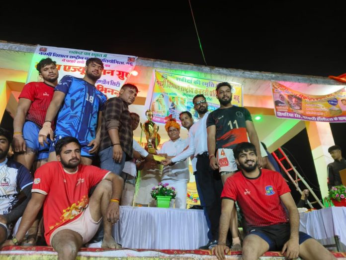 हिण्डौन। शहीदों की स्मृति में गांव महू में चल रही तीन दिवसीय नवमी विशाल राष्ट्रीय कबड्डी प्रतियोगिता का रविवार को समापन हुआ । आयोजन कमेटी के सदस्य सदस्य सोनू सोलंकी ने बताया कि प्रतियोगिता में 20टीमों ने भाग लिया प्रतियोगिता में फाईनल मैच जीरोता टीम और महू स्टेडियम टीम के बीच हुआ जिसमें जीरोता टीम ने मैच जीता । प्रतियोगिता समापन समारोह के अतिथि राजस्थान युवा जाट महासभा करौली के जिलाध्यक्ष करतार सिंह चौधरी धंधावली, राजकीय उच्च माध्यमिक विद्यालय हुक्मीखेडा के प्राचार्य राजेश, राजकीय उच्च माध्यमिक विद्यालय खीपकापुरा के प्राचार्य दयाल सोलंकी, गजानंद सोलंकी, गजानंद गुप्ता, अजीत सोलंकी रहे। अतिथियों के द्वारा प्रतियोगिता में रही प्रथम विजेता टीम जीरोता को 51000 रू नगद राशि , मैडल और शील्ड व द्वितीय विजेता महू सीनियर 21000रू नगद राशि, मैडल व शील्ड और तृतीय विजेता टीम भरतपुर को 7100 रुपए देकर सम्मानित किया गया । इस अवसर पर आयोजन कमेटी के सोनू चौधरी पीटीआई निर्मल,चिंटू सोलंकी पीटीआई सर्वोदय, रवि पहलवान आदि मौजूद रहे।