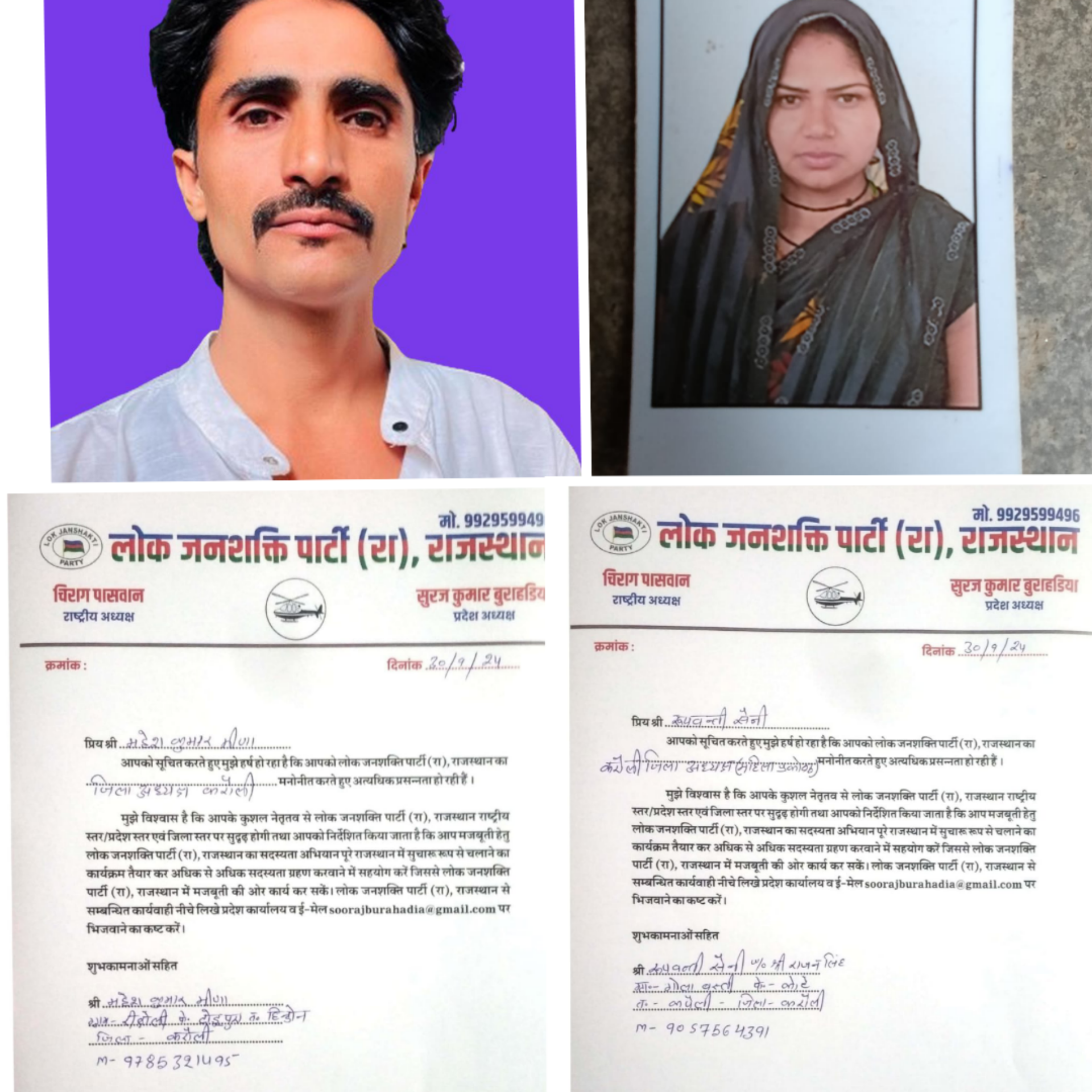 करौली में लोक शक्ति पार्टी रामविलास पासवान प्रदेश सचिव महेंद्र चौधरी ने बताया की लोक जनशक्ति पार्टी (रामविलास )के राष्ट्रीय अध्यक्ष कैबिनेट मंत्री चिराग पासवान के निर्देश अनुसार राजस्थान के प्रदेश अध्यक्ष सूरज कुमार बुराडिया ने करौली जिला अध्यक्ष पद पर महेश राज मीणा पुत्र कुंजीलाल मीणा निवासी मधुबन बिहार करौली को नियुक्त किया है साथ ही निर्देश दिया है कि 15 दिवस में अपनी कार्यकारिणी गठन कर प्रदेश कार्यालय भिजवाए एवं महिला प्रकोष्ठ जिला अध्यक्ष पद पर रुपवंती सैनी राजन सिंह कोटे महोली को बनाया है लोजपा प्रदेश सचिव महेंद्र कुमार चौधरी, प्रदेश सचिव धर्मेंद्र गुनावत, महिला सेल की प्रदेश सचिव सीमा शर्मा, लोजपा के, राजकुमार शर्मा, बृजलाल माली, किस्तूरा जाटव , जगमोहन जाटव आदि ने हर्ष व्यक्त किया है प्रदेश अध्यक्ष सूरज बरडिया को स्पष्ट किया है कि संगठन को जिले में बहुत तेज से मजबूत करेंगे ।