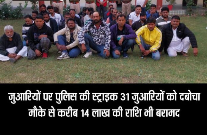 पुलिस ने मौके से करीब 14 लाख की नगदी सहित 31 जुआरियों को किया गिरफ्तार छक्का दाना पर खेल रहे थे जुआ डीआईजी ओमप्रकाश के निर्देशन में हुई इस कार्रवाई से गांधीनगर थाना पुलिस की कार्यशैली पर भी खड़े हो रहे सवाल पकड़े गए आरोपी आदतन जुआरी अजमेर नगर निगम के पार्षद पति निर्मल बेरवाल भी शामिल