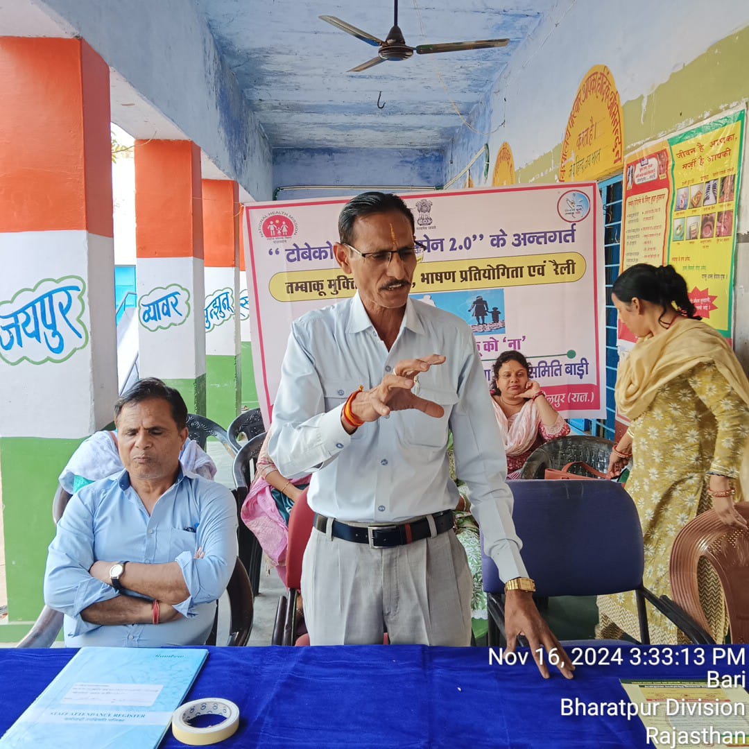 बाड़ी, 16 नवंबर 24 को राजकीय बालिका उच्च माध्यमिक विद्यालय बालिका नवीन बाड़ी में तंबाकू मुक्ति के लिए शपथ ग्रहण समारोह का आयोजन प्रभात संस्थान धौलपुर एवं युवा चेतना समिति बाड़ी धौलपुर के संयुक्त तत्वाधान में आयोजन किया गया। प्रभात संस्थान के निदेशक राकेश कुमार ने बताया कि टोबेको फ्री यूथ कैंपेन 2.0 पूरे भारतवर्ष में चलाया जा रहा है। धूम्रपान के दुष्प्रभाव इन आंकड़ों के माध्यम से देख सकते हैं। कि पूरे भारतवर्ष में लगभग 15 लाख मौत धूम्रपान की वजह से हो जाती है। और जो लोग धूम्रपान करने के बाद धुआ बाहर छोड़ते हैं। उसके प्रभाव से लगभग 1 लाख लोगों की मौत हो जाती है। अगर राजस्थान की बात करें, तो प्रत्येक दिन लगभग 200 मौतें हो जाती है। और साल भर में लगभग 80000 लोग धूम्रपान की वजह से अपनी जान गवा देते हैं।लगभग राजस्थान में आधी आबादी युवाओं की है। जो की तेजी से नशे की जकड़ में आता जा रहा है। इसलिए युवाओं को बचाने के लिए टोबैको फ्री यूथ कैंपेन चलाया जा रहा है।जागरूक करने के लिए यह अभियान चलाया जा रहा है। युवा चेतना समिति के अध्यक्ष रामदास तरुण ने बताया कि विद्यालय से 100 गज की दूरी में गुटखा तंबाकू बेचना दंडनीय अपराध है। और अगर विद्यालय परिसर में या सार्वजनिक स्थान पर कोई भी व्यक्ति धूम्रपान करते हुए, या बेचते हुए पाया जाता है, तो कानून के तहत ₹200 चालान कट सकता है। इस कार्यक्रम के मौके पर प्रधानाचार्य पप्पू सिंह रावत द्वारा सभी बच्चों को मीठी सुपारी , तंबाकू, बीड़ी …. या किसी भी प्रकार का धूम्रपान नहीं करने के लिए प्रेरित किया। अंत में सभी उपस्थित बच्चों को शपथ ग्रहण समारोह मैं सभी बच्चों और समस्त स्टाफ ने संकल्प लिया गया कि भविष्य में कभी भी धूम्रपान नहीं करेंगे और अपने परिचितों को धूम्रपान छोड़ने के लिए प्रेरित करेंगे। साथ ही अपने विद्यालय को धूम्रपान मुक्त बनाने के लिए भी पूरा प्रयास की करेंगे। इस अवसर पर संस्थान की ओर से राकेश कुमार, रामदास तरुण तथा स्कूल स्टाफ की ओर से प्रधान प्रधानाचार्य पप्पू सिंह ,रीना, मीना, अनीता मीणा, बलवीर मीणा, दीपिका मंगल, संगीता मीणा , निशा कुशवाह, अमीर बानो, हेमलता गर्ग ,शारदा गुर्जर सहित समस्त स्टाफ उपस्थित तरह रहा|