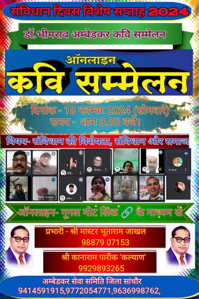 सांचौर – 18 नवंबर 2024 को अंबेडकर सेवा समिति सांचौर के तत्वावधान में संविधान दिवस सप्ताह के अंतर्गत प्रथम ऑनलाइन काव्य गोष्ठी का आयोजन गूगल मीट पर किया गया। इस आयोजन में विभिन्न कवियों ने अपनी उत्कृष्ट रचनाओं के माध्यम से संविधान, समाज और बाबा साहेब के विचारों को प्रस्तुत किया।