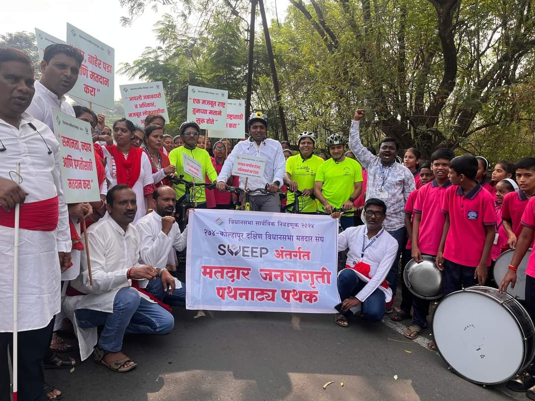 कोल्हापूर दि. 15: विधानसभा सार्वत्रिक निवडणुकीसाठी दिनांक 20 नोव्हेंबर रोजी मतदान होणार आहे. मतदानासाठी केवळ तीन दिवस बाकी असताना जिल्हा प्रशासनाकडून मतदार जनजागृती करून जास्तीत जास्त मतदान होण्यासाठी कसोशीने प्रयत्न करण्यात येत आहेत. मतदान जनजागृतीसाठी आज शनिवार दिनांक 16 नोव्हेंबर रोजी सकाळी जिल्हाधिकारी अमोल येडगे यांच्या समवेत इतर दहा सायकल स्वरांनी कोल्हापूर, उचगाव, मुडशिंगी, पट्टणकोडोली, हुपरी व परत कोल्हापूर असा पन्नास किलोमीटर अंतराचा सायकल प्रवास केला. या सायकल रॅलीला सकाळी सात वाजता पोलीस ग्राउंड, कोल्हापूर येथून सुरुवात झाली व त्याच ठिकाणी दहा वाजता सांगता झाली.