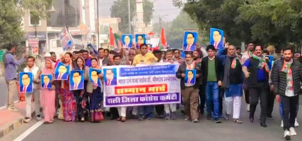 भारत रत्न बाबासाहेब डाॅ.अम्बेडकर. भीमराव अम्बेडकर जी के प्रति गलत टिप्पणी के विरोध में तथा राहुल गांधी पर झुठे आरोप लगाकर केस दर्ज करने के विरोध में राजस्थान, जिला पाली में एतिहासिक “बाबासाहेब भीमराव अम्बेडकर सम्मान मोर्चा जुलस निकाला गया अम्बेडकर सर्किल पर बाबा साहेब की प्रतिमा पर माला पहनाकर मुख्य मार्गो से होते कलेक्टर कार्यालय तक मोर्चा निकालकर नारेबाजी कर जिला कलेक्टर को महामहिम राष्ट्रपति जी के नाम पर ज्ञापन सौंपकर माननीय अमित शाह को मंत्री पद से बर्खास्त करने की मांग की गई।
