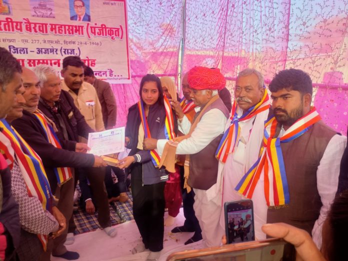 जिला अध्यक्ष श कालूराम बैरवा की अध्यक्षता में समारोह के मुख्य अतिथि राष्ट्रीय संगठन मंत्री डॉ. श्यामलाल बैरवा,, अति विशिष्ट 1008 बीरम देव महाराज छापानेरी, रामदयाल बैरवा , शिवराज बैरवा, कानाराम बैरवा बोराडा, शिवराज बैरवा डबरेला, रामदयाल बैरवा कोटड़ी,सीताराम बैरवा ,समारोह में उपस्थित रहे । सम्मान समारोह में सत्र 2023-24 में कक्षा 10 वीं, 12वीं, स्नातक, स्नातकोत्तर परीक्षा में 75 प्रतिशत से अधिक अंक प्राप्त करने वाले छात्र छात्राओं एवं राजकीय सेवा में नव नियुक्त कार्मिकों को सम्मानित किया गया जिला अजमेर केकड़ी ,ब्यावर के समस्त क्षेत्रों के विभिन्न प्रतिभावान को सम्मानित किया गया 32 राजकीय सेवा में नवचयनित और 175 प्रतिभावान छात्र छात्राओं को सम्मानित किया गया जिसमें राज्य स्तर बॉलीबॉल चयन, कुश्ती जूडो, एथेलेटिक्स दौड़ सिल्वर गोल्ड मेडल जीतने वाले 10,12,BA,MA,Bed,STC, ITI आदि को माला, मोमेंटो एवं प्रमाण पत्र प्रदान किए गए । आयोजक ग्राम डबरेला के शिवराज बैरवा, बंशी लाल बैरवा, बजरंग लाल बैरवा, प्रभाती लाल बैरवा, रामकुंवार बैरवा, सांवरा बैरवा , लाल शंकर बैरवा महेंद्र बैरवा, छोटू लाल बैरवा उपस्थित रहे।