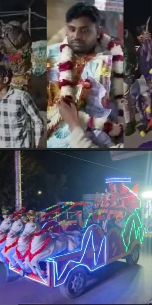 डीग,, कस्बे में निकाली गई अनोखी बारात बन गई चर्चा का विषय। अनोखी बारात को देखने के लिए लोगों का लग गया हुजूम। प्राप्त जानकारी अनुसार डीग नगर पालिका में सफाई कर्मचारी के पद पर कार्यरत जयंत कुमार की बेटी बबीता कुमारी की दिल्ली निवासी प्रॉपर्टी डीलर साहिल के साथ यह हुई थी शादी। दलित परिवार के बेटी की दिल्ली से आई अनोखी बारात ने लोगों का ध्यान आकर्षित किया। बारात में लोग बकरियों को नचाते नजर आए साथ ही बारात में बैंड, डीजे, रथ और देवी-देवताओं की आकर्षक झांकियां भी दिखी। दिल्ली से लग्जरी कारों ने आई बारात में डांसिंग कारें भी शामिल थी। बारात में कलाकारों के डांस ग्रुप भी आए, जिनमें महिला डांसर भी शामिल थी। कलाकारों ने फिल्मी गीतों और डीजे की धुनों पर जमकर डांस किया। दिल्ली से आई बारात मुख्य बाजार घंटाघर से प्रारंभ होकर शहर के विभिन्न मार्गों से होकर हरिजन बस्ती पहुंची। बारात को देखने के लिए लोगों की भीड़ उमड़ पड़ी। बारात देखने के लिए लोग सर्द भरी रात में सड़कों और मकानों की छतों पर काफी देर तक खड़े रहे।
