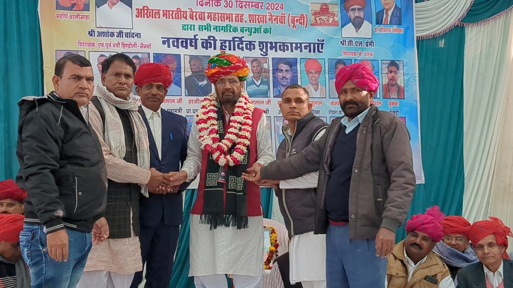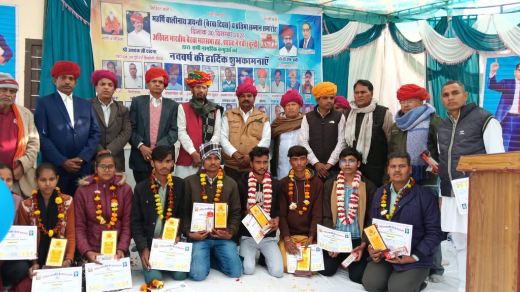 नैनवा -: आज दिनांक 30/12/2024 को महर्षि बालीनाथ छात्रावास तहसील नैनवा पर अखिल भारतीय बैरवा महासभा नैनवा द्वारा महर्षि बाली नाथ जयंती को बैरवा दिवस के रूप में मनाया गया एवम् बोर्ड परीक्षाओं में 75% से अधिक अंक प्राप्त करने वालों को सम्मानित कर प्रतिभा सम्मान समारोह का आयोजन किया गया साथ ही विधायक कोष से निर्मित भवन का लोकार्पण किया गया इस कार्यक्रम के मुख्य अतिथि श्रीमान सी एल प्रेमी विधायक केशोरायपाटन व कार्यक्रम की अध्यक्षता श्रीमान प्रभु दयाल जी ललावत (राष्ट्रीय संरक्षक), विशिष्ट अतिथि ओमप्रकाश फौजी (जिला अध्यक्ष) , मोहनलाल बैरवा (जिला महामंत्री) , लक्ष्मण बैरवा (ब्लॉक अध्यक्ष हिंडोली) , बाबूलाल वर्मा , हरजीलाल बैरवा (प्रांतीय प्रचार मंत्री) कमल कुमार मरमीट (प्राचार्य) ,राजू लाल कोरमा आदि विशिष्ट अतिथि उपस्थित रहे ।इन्होंने महर्षि बालीनाथ के जीवन पर प्रकाश डाला विधायक सी एल प्रेमी ने विधायक कोष से 10 लाख रुपए छात्रावास में देने की घोषणा की तथा प्रेमी जी ने विधायक हिंडोली अशोक चांदना से भी छात्रावास में पुस्तकालय भवन हेतू 10 लाख रुपए दिलवाने की घोषणा की । इस कार्यक्रम में हीरालाल बैरवा (अध्यक्ष) गिरिराज बैरवा (सचिव) नाथू लाल बैरवा (कोषाध्यक्ष) , बजरंग लाल मोडसा , लक्ष्मण बैरवा देवपुरा ,शोभाग , मोहनलाल गोमे , राम प्रकाश , प्रहलाद , सोजीलाल , रमेश , बनवारी लाल , रामप्रसाद , अंबालाल , सुरेंद्र , राजाराम , राजू लाल , रमेश , मुकेश , सुरेश , सुखलाल , रामप्रसाद , अशोक , कन्हैयालाल , बाबूलाल एवं 70 प्रतिभाओं को सम्मानित किया गया कार्यक्रम में लगभग 1200 समाज बंधु उपस्थित रहे
