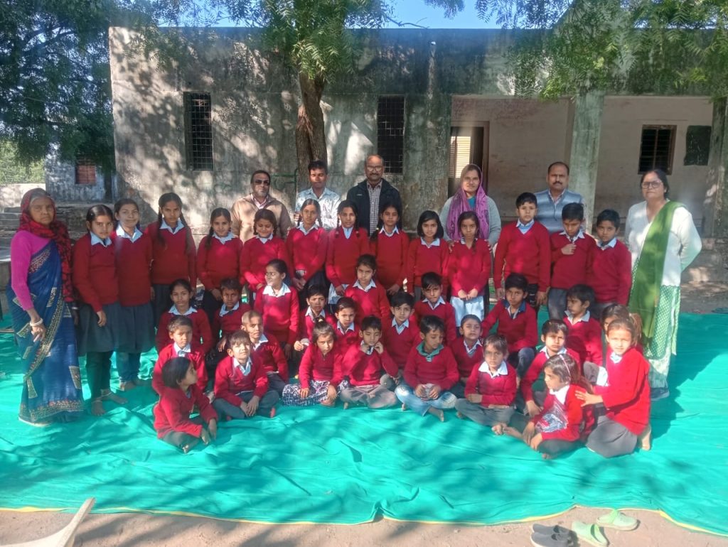 अध्यापिका गुलाब बाई के द्वारा कक्षा 1 से 5 वी तक के समस्त छात्र छात्राओं को जर्सी वितरण की गई