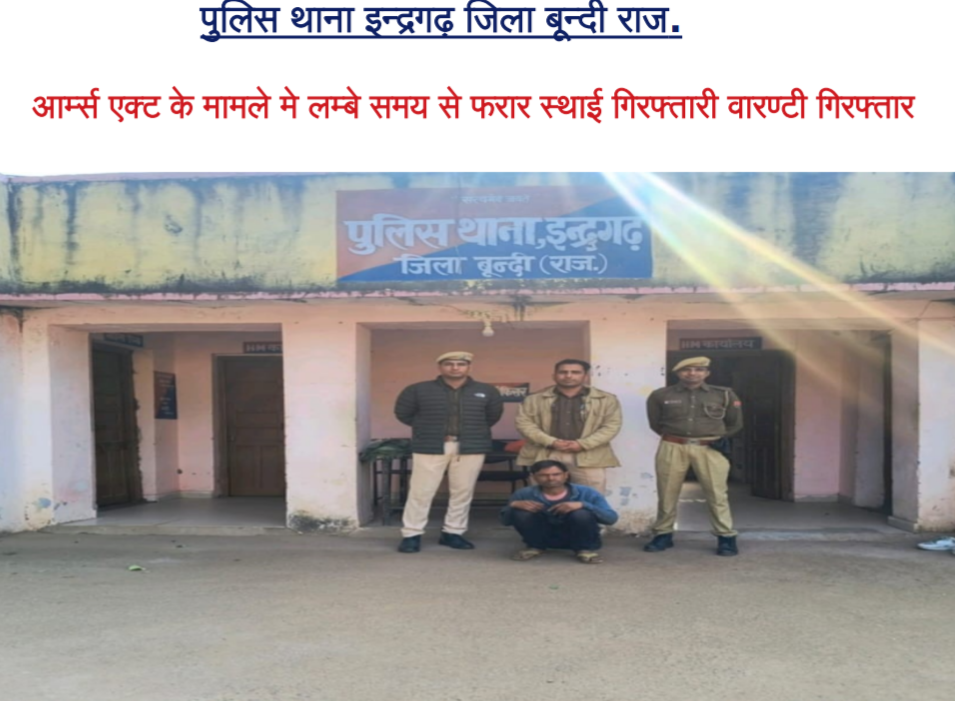 इन्द्रगढ़ -: जिला पुलिस अधीक्षक बूंदी द्वारा वांछित फरार अपराधियों की धरपड़क कर अधिक से अधिक कार्रवाई हेतु निर्देशित किया हुआ है उक्त निर्देशों की पालना में श्रीमती उषा शर्मा अतिरिक्त पुलिस अधीक्षक बूंदी के मार्गदर्शन में व वृत्ताधिकारी श्री नरेंद्र नागर वृत्त लाखेरी के सुपरविजन में थाना अधिकारी श्री दिनेश शर्मा पुलिस थाना इंदरगढ़ के नेतृत्व में गठित पुलिस टीम द्वारा तकनीकी साक्ष्य एवं मुखबीर सूचना के आधार पर स्थाई गिरफ्तारी वारंटी की तलाश शुरू की गई वर्ष 2022 के आर्म्स एक्ट के मामले में न्यायालय जेएम इंदरगढ़ द्वारा जारी स्थाई गिरफ्तारी वारंटी जो लंबे समय से फरार चल रहा था जिसकी गिरफ्तारी हेतु तकनीकी एवं मुखबिर तंत्र के द्वारा वारंटी की पूर्ण जानकारी एकत्रित कर आज दिनांक 14 जनवरी 2025 को स्थाई गिरफ्तारी वारंटी राजेश बैरवा को ग्राम मसावदा जिला करौली से गिरफ्तार किया जाकर स्थाई गिरफ्तारी वारंटी का निस्तारण किया गया