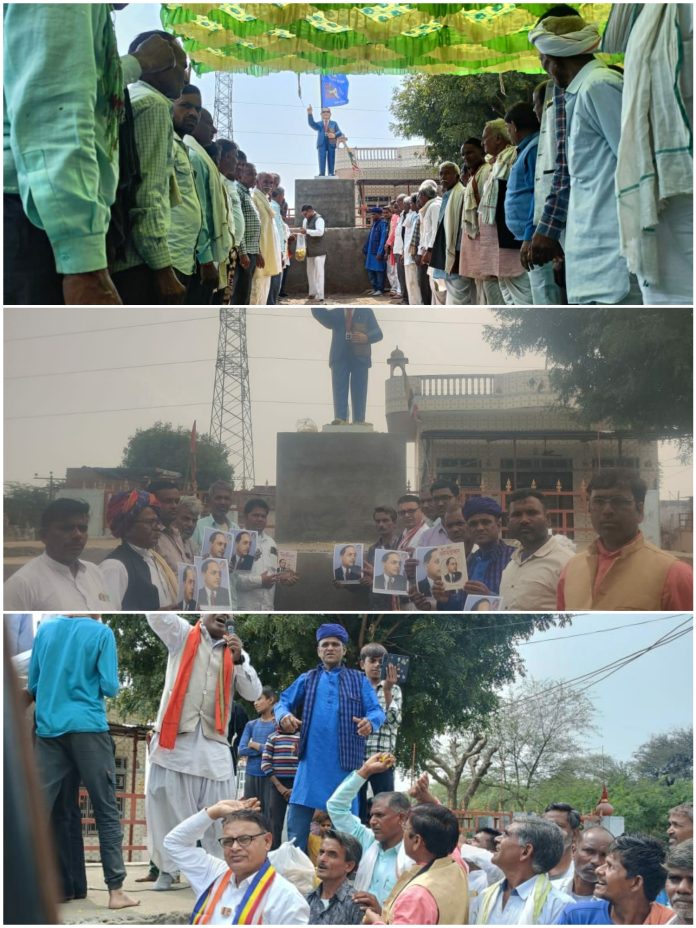 आज दिनांक 2 मार्च को भारतीय बौद्ध महासभा राजस्थान ( दक्षिण)के सानिध्य में सवाईमाधोपुर जिले के गंगानगर गांव में बाबा साहब डॉ भीमराव अम्बेडकर जी की मूर्ति की स्थापना की गई जिसकी स्थापना बौद्धाचार्य रामचरण बौद्ध प्रदेश महामंत्री राजस्थान कराई गई साथ मे बौद्धाचार्य रामसिंह बौद्ध ने साथ दिया। यहां कार्यक्रम में ग्राम गंगानगर गांव के आसपास के करीब 20,25 गांवों के लोग मौजूद थे कार्यक्रम में सैकड़ों लोग उपस्थित रहें। यहां बोधिसत्व बाबा साहब डॉ भीमराव अम्बेडकर जी की मूर्ति के लिए ग्रामीण भामाशाहों में मा.मोहनलालजी, प्रभुलाल जी,मा.राजूलाल जी,मा.बाबूलाल जी,मा.राजमल जी,मा.हेमराज s/oजगदीश जी,मा.कमलेश/गणेश जी,मा.राजेश/लादूलाल जी,मा.हजारीलाल वकील मा. रामनिवास/चिरंजी लाल जी,मा. राजेन्द्र/प्रहलाद जी,मा. पप्पू लाल जी डार्ईवर आदि लोगों के धम्मदान से मूर्ति स्थापना हुई। कार्यक्रम की अध्यक्षता भारतीय बौद्ध महासभा प्रदेश महामंत्री ने की स्थापना के बाद मोमबत्ती प्रज्वलित कर एवं पुष्प अर्पित किए एवं सभी ग्रामवासियों ने बारी-बारी से बाबा साहब डॉ भीमराव अम्बेडकर जी को पुष्प अर्पित कर कार्यक्रम में शामिल हुए सभी लोगों ने सामूहिक त्रिशरण पंचशील कराया गया कार्यक्रम में ग्रामीण सभा के अध्यक्ष मोहन लाल द्वारा समाज को बाबा साहब के विचारों पर प्रकाश डालते हुए कहा कि हम सब को बाबा साहब के बताए मार्ग पर चलना चाहिए और सभी समाज को एकजुट रहना चाहिए अभी तक हम अन्धविश्वास के अंधेरे में जी रहे थे।वो अंधेरा आज़ बाबा साहब की संस्था के माध्यम से मिटाया गया अगर भारतीय बौद्ध महासभा के पदाधिकारियों ने आकर हमारे जीवन को प्रकाश की ओर दिशा दिखाने का कार्य किया है अन्यथा हम बाबा साहब का अपमान करने जा रहे थे। क्योंकि हम अनजान लोग बाबा साहब डॉ भीमराव अम्बेडकर जी की मूर्ति की स्थापना ब्राह्मण द्वारा करवाते जो कि हम सभी ग्रामवासियों से बहुत बड़ा पाप होने से बच गया।अब आगे से सभी कार्य हम भारतीय बौद्ध महासभा राजस्थान (दक्षिण) के दिशा निर्देशों के अनुसार करेंगे और बाबा साहब के बताए मार्ग पर चलेंगे। सभी ग्रामवासियों को भारतीय बौद्ध महासभा राजस्थान दक्षिण की ओर से बोधिसत्व बाबा साहब डॉ भीमराव अम्बेडकर जी का छापा चित्र भेंट किया गया। संचालन मा.रामखिलारी ने किया एवं दिनेश कुमार जी ने किया ग्रामवासियों द्वारा भारतीय बौद्ध महासभा राजस्थान दक्षिण के पदाधिकारियों का स्वागत किया गया। जिला अध्यक्ष भारतीय बौद्ध महासभा सवाईमाधोपुर रायसिंह बौद्ध ने सब्बे सत्ता करवा कर कार्यक्रम का समापन किया एवं ग्राम अध्यक्ष द्वारा सभी का आभार व्यक्त किया।