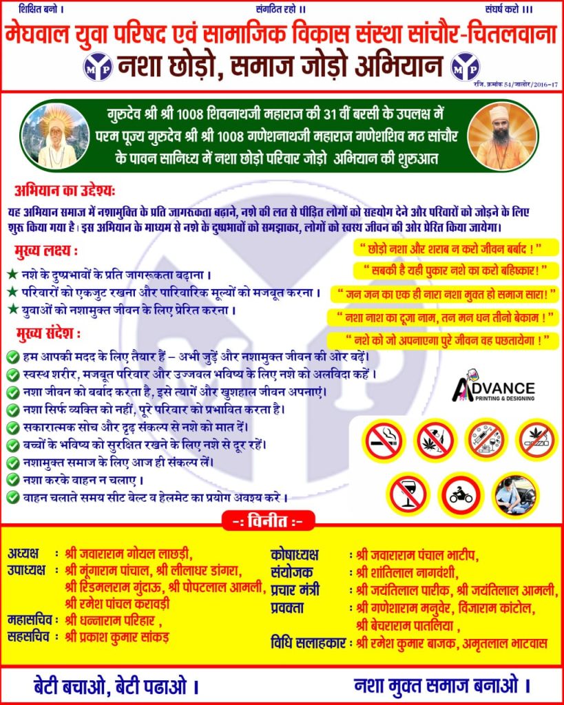 मेघवाल युवा परिषद एवं विकास संस्थान सांचोर द्वारा “नशा छोड़ो, समाज जोड़ो अभियान” के तहत पेम्पलेट वितरण कर दिया जागरूकता संदेश