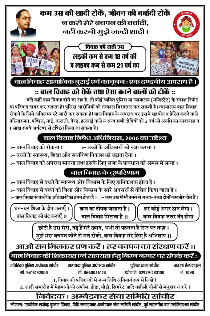 सांचौर – अम्बेडकर सेवा समिति सांचौर के तत्वावधान में शनिवार को एक विशेष कार्यक्रम आयोजित कर बाल विवाह जैसी सामाजिक बुराई के प्रति जन-जागृति लाने हेतु पेम्पलेट का विमोचन किया गया। यह कार्यक्रम अतिरिक्त पुलिस अधीक्षक आवड़दान रतनू की गरिमामयी उपस्थिति में संपन्न हुआ।