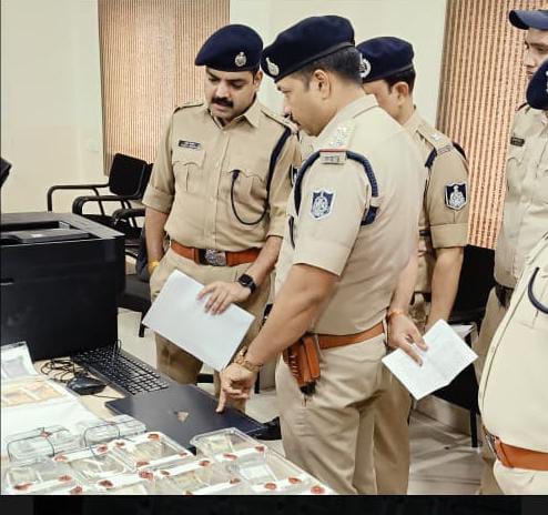 नकली नोट निर्माण के बड़े रैकेट का पर्दाफाश,15.41 लाख की नकली करंसी जप्त,05 आरोपी गिरफ्तार, हाईटेक उपकरणों से बना रहे थे नकली नोट,विश्वसनीय मुखबिर सूचना पर थाना बैंक नोट प्रेस की प्रभावी कार्यवाही,मुख्य आरोपी ने जेल में रची थी साजिशनकली नोट निर्माण के बड़े रैकेट का पर्दाफाश,15.41 लाख की नकली करंसी जप्त,05 आरोपी गिरफ्तार, हाईटेक उपकरणों से बना रहे थे नकली नोट,विश्वसनीय मुखबिर सूचना पर थाना बैंक नोट प्रेस की प्रभावी कार्यवाही,मुख्य आरोपी ने जेल में रची थीदेवास। – जिला देवास पुलिस द्वारा अपराधों पर प्रभावी नियंत्रण एवं समाज में कानून का भय स्थापित करने हेतु चलाए जा रहे अभियान के तहत थाना बैंक नोट प्रेस पुलिस को एक महत्वपूर्ण सफलता प्राप्त हुई है । नकली नोटों के निर्माण एवं अवैध संचालन में लिप्त अंतरजिला गिरोह का पर्दाफाश करते हुए लगभग ₹16,00,000/- से अधिक मूल्य के नकली नोट,उन्हें तैयार करने की सामग्री एवं उपकरण जब्त कर 05 आरोपियों को गिरफ्तार किया गया है। दिनांक 01/06/2025 को थाना प्रभारी बैंक नोट प्रेस को विश्वसनीय सूत्रों से सूचना मिली कि आरोपी सचिन नागर एवं शुभम वर्मा द्वारा नकली नोट लेकर जा रहे है । जिस पर से उक्त सूचना से तत्काल वरिष्ठ अधिकारियो को अवगत कराया गया । पुलिस अधीक्षक देवास श्री पुनीत गेहलोद ने उक्त सूचना की गंभीरता को देखते हुए तत्काल कार्यवाही हेतु निर्देशित किया । जिस पर से अतिरिक्त पुलिस अधीक्षक (शहर) श्री जयवीर सिंह भदौरिया के मार्गदर्शन में उप पुलिस अधीक्षक (एल-आर) श्री संजय शर्मा के निर्देशन में थाना प्रभारी बैंक नोट प्रेस श्री अमित सोलंकी के नेतृत्व में 02 विशेष टीमों का गठन किया गया । उक्त टीमों ने आरोपी सचिन नागर एवं शुभम वर्मा को गिरफ्तार कर उनके कब्जे से ₹1,96,200/- के नकली नोट एवं एक काली रंग की स्प्लेंडर मोटरसाइकिल जब्त की जाकर आरोपियो के विरूद्ध थाना बैंक नोट प्रेस में अपराध क्रमांक 556/2025 धारा 178,179,180, 61(2) BNS का अपराध पंजीबद्ध कर विवेचना में लिया गया । उक्त आरोपियो से पूछताछ में ज्ञात हुआ कि आरोपी राजकुमार मालवीय ग्राम दूधलाई सोनकच्छ, द्वारा अपने निवास पर नकली नोटों का निर्माण किया जा रहा है । तत्काल कार्यवाही करते हुए पुलिस टीमों के द्वारा आरोपी राजकुमार के घर पर दबिश दी गई, जहाँ से आरोपी राजकुमार मालवीय एवं सुनील पाटिल को गिरफ़्तार कर उनके कब्जे से ₹13,25,000/ 500 की नकली नोटों की गड्डियाँ तथा नोट निर्माण में प्रयुक्त उपकरण एवं अन्य सामग्री बरामद की गई । बाद अनुसंधान में आरोपी शक्ति सिंह चावड़ा को भी गिरफ़्तार किया गया । *जप्तशुदा सामग्री :*- ₹15,41,200/- के नकली नोट,लैपटॉप,प्रिंटर,स्केनिंग पेटी,100-200-500 के अर्द्ध छपे प्रिंट पेपर एवं 02 मोटर साइकिल जप्त ।*गिरफ्तार आरोपियों के नाम :*-1.सुनील पाटिल प
