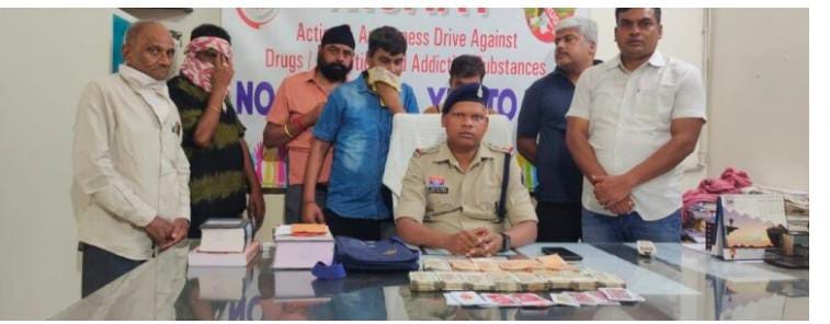 बिलासपुर,मुखबीर सूचना मिला कि होटल टाईम स्क्वेयर के बंद कमरा में कुछ लोगो के द्वारा जुआ खेलने की सूचना प्राप्त हुआ उक्त सूचना के संबंध में तत्काल वरिष्ठ पुलिस अधीक्षक रजनेश सिंह (भापुसे के निर्देश पर निरी. कृष्णचंद सिदार थाना प्रभारी थाना तारबाहर एवं एसीसीयू प्रभारी अजरूद्दीन के नेतृत्व में संयुक्त टीम बनाकर होटल टाईम स्क्वेयर में रेड कार्यवाही किया जहां पर उक्त आरोपीगणो के द्वारा 52 पत्ती ताश से जुआ खेल रहे थे जिसे तत्काल घेराबंदी कर आरोपीगणो को पकडा गया है आरोपी गणो के पास से 52 पत्ती ताश एवं नगदी कुल 516000 रूप्ये को जप्त कर विधीवत् कार्यवही किया गया है।