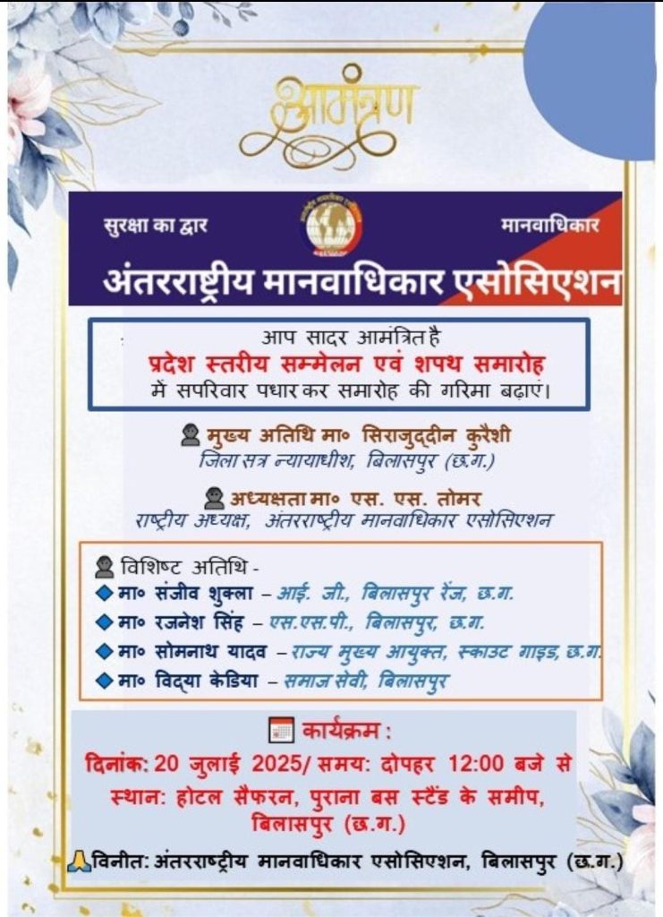 बिलासपुर।अंतरराष्ट्रीय मानवाधिकार एसोसिएशन द्वारा प्रदेश स्तरीय सम्मेलन एवं शपथ समारोह का आयोजन 20 जुलाई को किया जा रहा है। सम्मेलन में मुख्य अभ्यागत के रूप में माननीय जिला एवं सत्र न्यायाधीश सिराजुद्दीन कुरैशी शामिल रहेंगे।