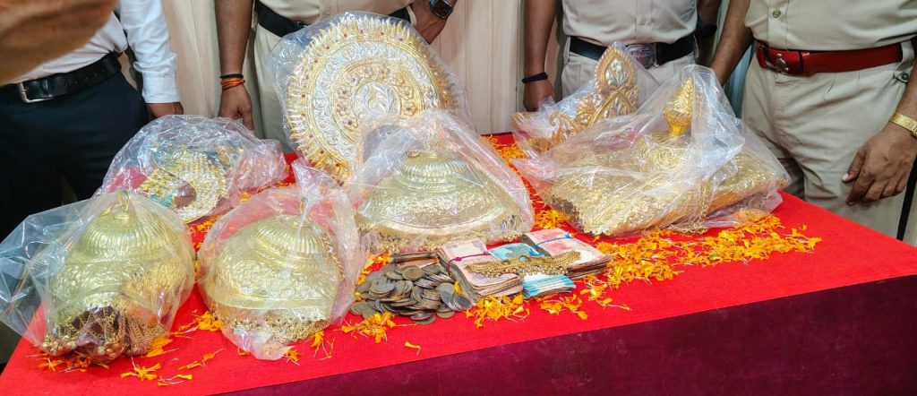 सोने का हार, मुकुट, कुण्डल, 4 नग छत्तर, नकदी 10,000 रूपये, घटना में प्रयुक्त रॉड, एक मोटर सायकल बजाज प्लेटिना, संतरा रंग के टी शर्ट कुल 26 लाख 80 हजार रूपये ।