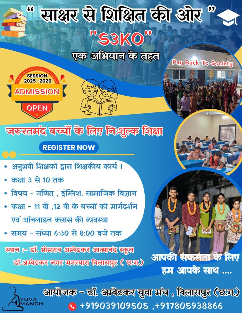 डॉ. अंबेडकर युवा मंच द्वारा संचालित "साक्षर से शिक्षित की ओर (S3KO)" अभियान के अंतर्गत ज़रूरतमंद छात्र-छात्राओं के लिए निःशुल्क ट्यूशन क्लासेस की प्रवेश प्रक्रिया चल रही है।*