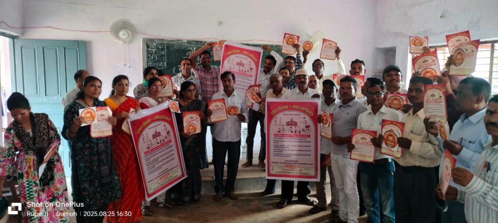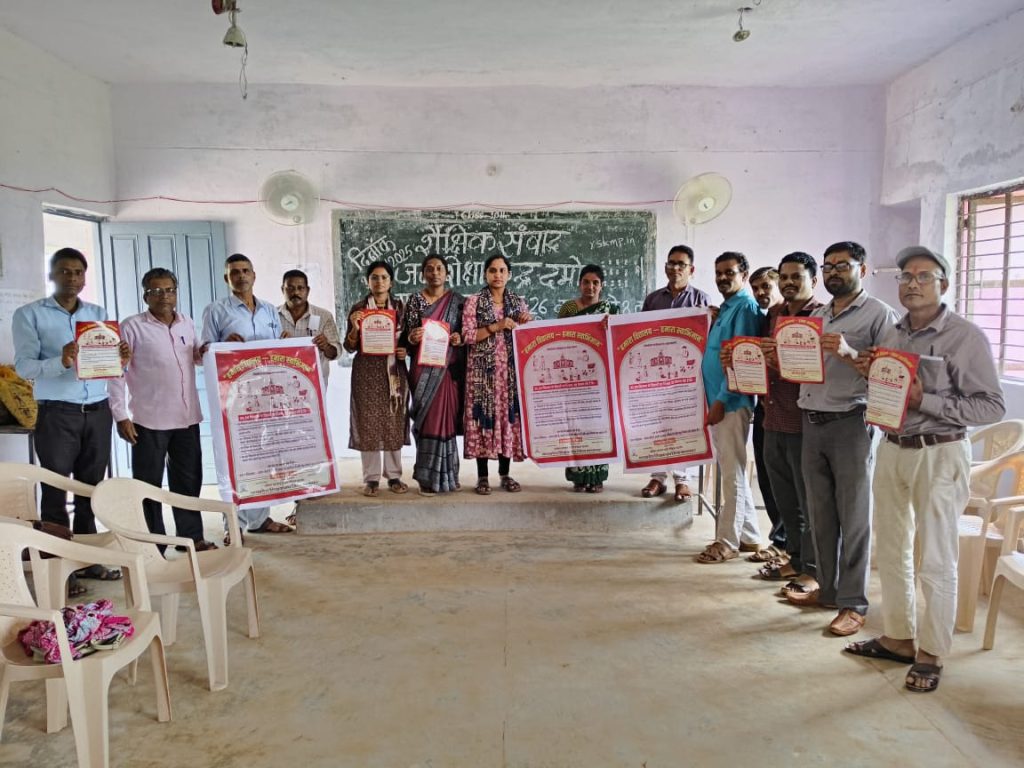 दमोह (बालाघाट)अखिल भारतीय राष्ट्रीय शैक्षिक महासंघ म.प्र.शिक्षक संघ के आव्हान पर म.प्र.शासन लोक शिक्षण संचालनालय सहित जिला शिक्षा अधिकारी के आदेशानुसार 01सितम्बर 2025 दिन को मध्यप्रदेश में सभी शालाओं में “हमारा विद्यालय – हमारा स्वाभिमान” संकल्प पत्र का वाचन कर संकल्प लिया जाना है।तत्सबंध में संकल्प पत्र पोस्टर का विमोचन गत दिवस जनशिक्षा केन्द्र दमोह में आयोजित शैक्षिक संवाद कार्यक्रम में शैक्षिक संवाद समापन पश्चात, नोडल अधिकारी जनशिक्षक रमेश तुरकर , ब्लाक अध्यक्ष म प्र शिक्षक संघ बिरसा भागीरथी पांचे जी, संभागीय सदस्य एस आर उके , वरिष्ठ सदस्य हेमेंद्र नेवारे, ब्लाक शाखा बिरसा के पदाधिकारी सर्व सुजित खोबरागड़े, सत्यप्रकाश अन्मोले, रूपेश खरोले, किशोर पटले, कैलाश मेरावी, सनुकलाल मरकाम, जितेन्द्र वासनिक,व सहज कर्ता हुकुम गौतम , संतोष यादव, रमसुला धुर्वे एवं सभी प्रतिभागी उपस्थित सम्माननीय शिक्षक साथियों द्वारा किया गया। इस अवसर संगठन के पदाधिकारीयों द्वारा बताया गया कि,इस बहुआयामी प्रोग्राम के तहत सभी शिक्षक और बच्चे विद्यालय को हर कसौटीयो पर उत्कृष्ट बनाने का संकल्प लेंगे । समस्त शासकीय विद्यालयों में शैक्षणिक गुणवत्ता, उत्कृष्ट परीक्षा परिणाम, अनुशासन पर्यावरण सौन्दर्य, छात्रो के चरित्र निर्माण, सेवा समर्पण संस्कार तथा भेदभाव रहित वातावरण निर्मित करने की दृष्टि से यह कार्यक्रम हो रहा है। एक सितंबर को हमारा विद्यालय, हमारा स्वाभिमान राष्ट्रहित के विचार और भावों को लेकर स्कूलों के शिक्षक और अध्ययनरत विद्यार्थी एक साझा संकल्प का वाचन करेगें। यह वाचन प्रार्थना समय के आधे घंटे की अवधि में करवाये जाने की अपील संगठन द्वारा सभी संस्था प्रमुखों से की गई है। म.प्र.शिक्षक संघ बिरसा के द्वारा इस सम्बंध में सभी शैक्षणिक संस्थाओं में संकल्प पत्र, पोस्टर वितरित कर व्यापक प्रसार प्रचार पूर्ण कर ली हैं।